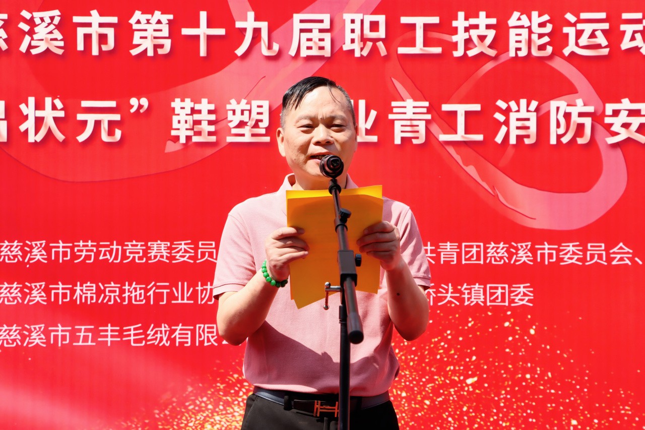 为进一步加强鞋塑企业消防安全管理水平,有效提高企业应急能力,切实提升企业员工的消防安全意识和救早救小能力,今天下午,恰逢我镇“每月9日”消防安全主题宣传日,慈溪市第十九届职工技能运动会暨“行行出状元”鞋塑企业青工消防安全技能大赛在桥头成功举办。该活动由慈溪市劳动竞赛委员会、慈溪市总工会、共青团慈溪市委员会、桥头镇人民政府联合主办,慈溪市棉凉拖行业协会、桥头镇总工会、桥头镇团委承办,慈溪市五丰毛绒有限公司协办。
