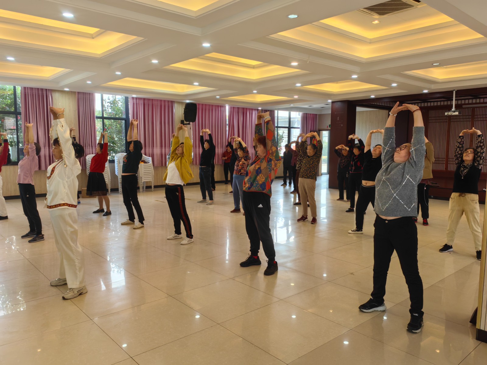 活动现场,身着轻便运动装的妇女同胞们整齐列队,在轻柔音乐的伴奏下,跟随何阿姨的口令缓缓舒展双臂。“双手托天理三焦,左右开弓似射雕……”这些原本略显生涩的动作,在教练耐心示范与分解教学中逐渐变得协调流畅。考虑到参与群体多为中老年人,何阿姨特意调整动作幅度,放慢节奏,并重点讲解“调息吐纳”与动作要领的结合,帮助大家更好掌握八段锦“形神兼备”的练习精髓。