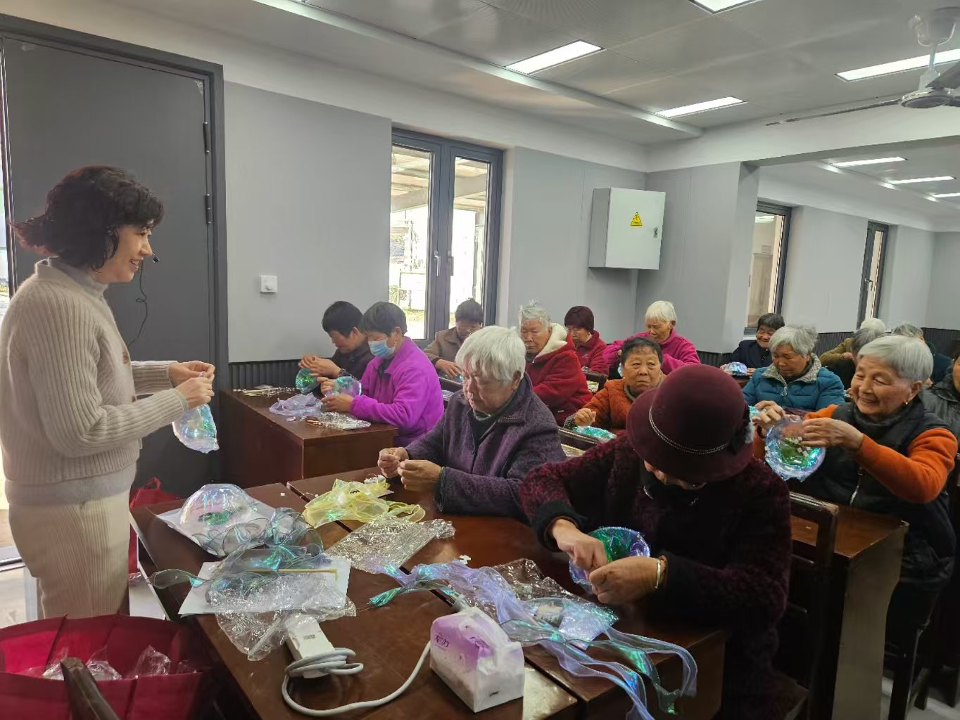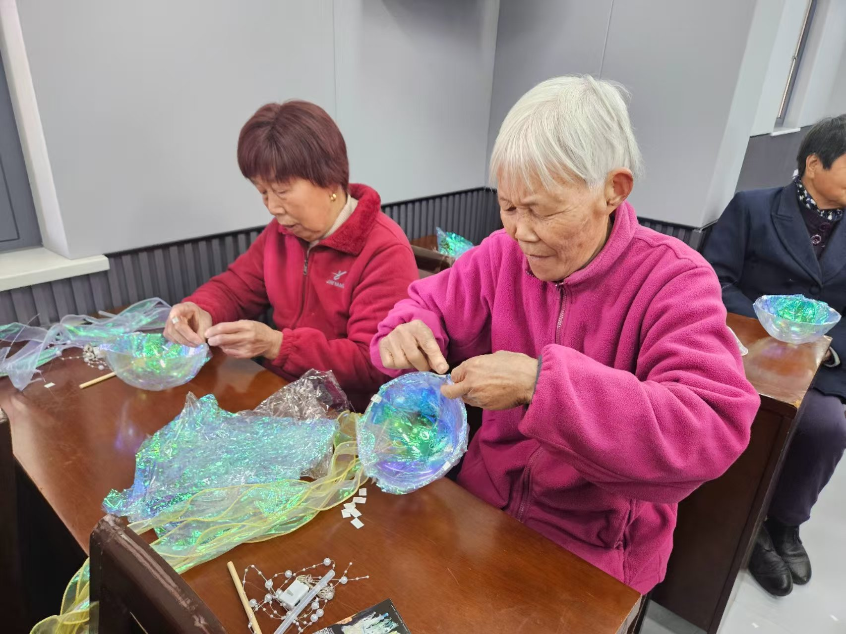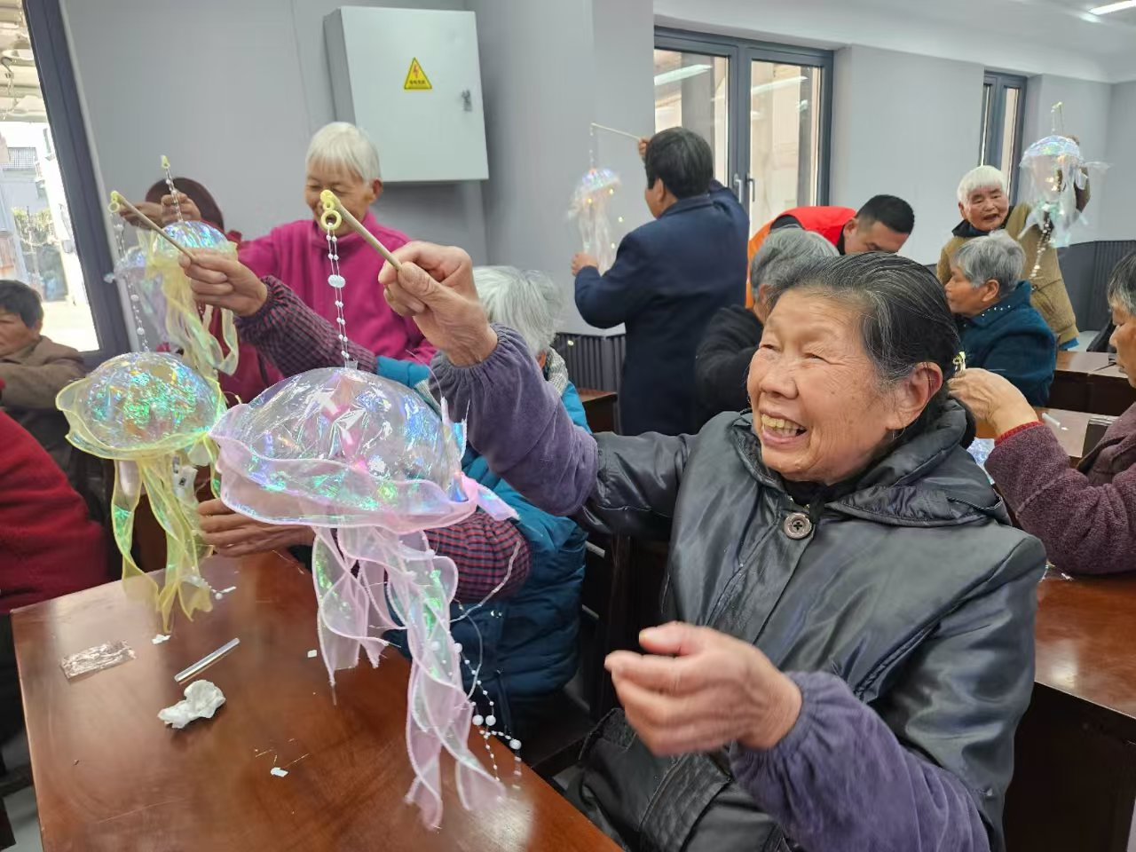 为丰富社区老年人精神文化生活,促进老年人感官机能锻炼与社会参与,近日,九龙湖镇杜夹岙村举办"创造温馨氛围,传承匠心艺术"水母灯DIY主题活动。活动通过趣味手工制作,帮助老年群体实现五感刺激、延缓感官退化,同时搭建互动交流平台,让老年人在艺术创作中重拾生活热情。