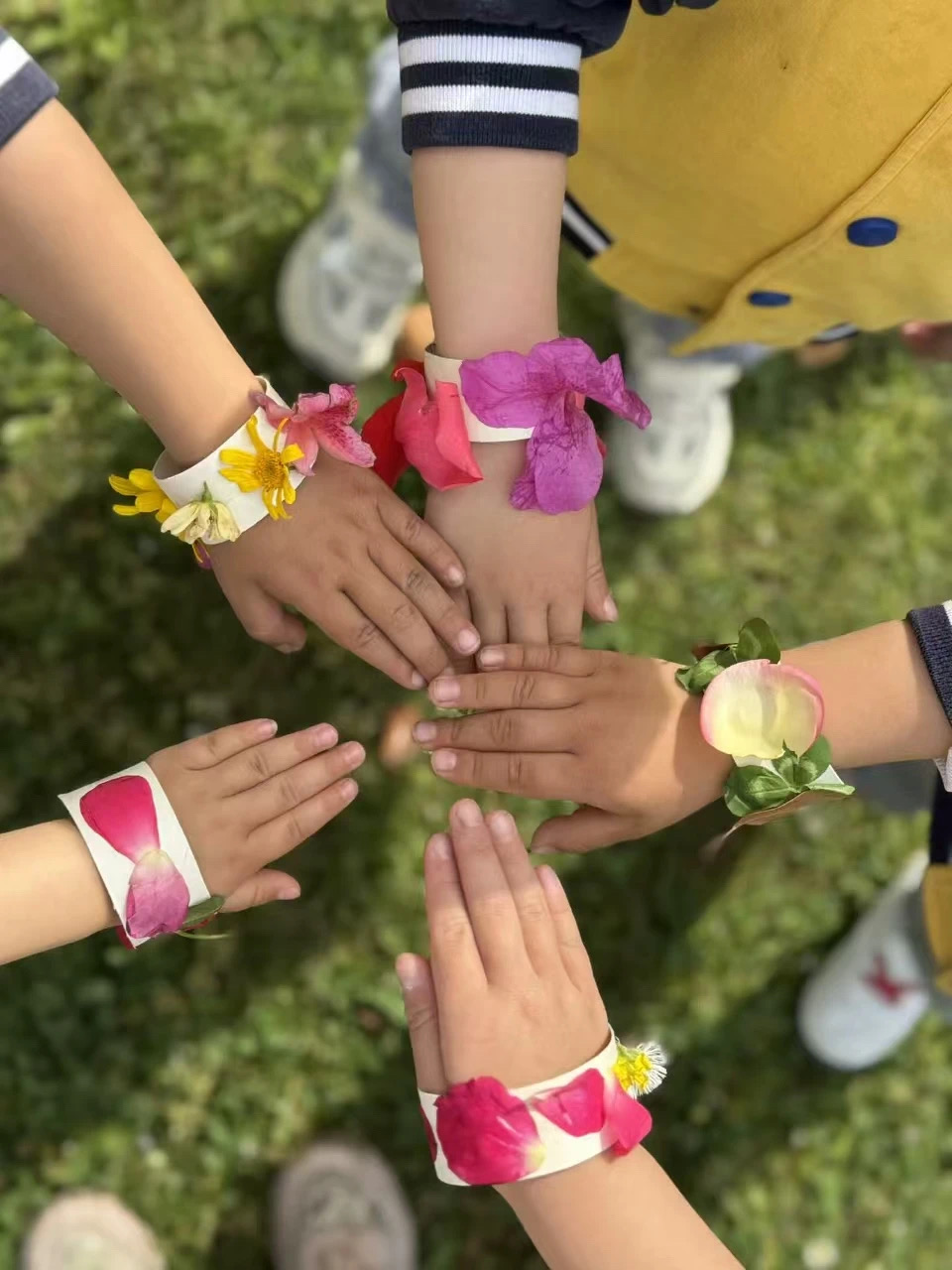 迎着和煦的春风,一张张纯真的小脸上洋溢着对自然满满的向往,孩子们在在幼儿园里寻找春天的踪迹。小班的小朋友们制作春天的手环,他们在幼儿园里寻找花瓣、树叶,把这些粘贴在手环上,制作完成后,戴上特制的春日手环,仿佛戴上了一圈圈幸福的魔法,兴奋地穿梭在幼儿园的每个角落,他们用自己的方式收集着春天,让整个幼儿园都洋溢着春天的气息。