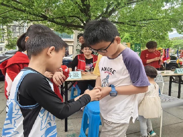 “称一称,灾病全跑掉,我们的小宝贝准能长高高!”在称人区,社区教育志愿者们一边用传统地萝为孩子们称重,一边绘声绘色地讲述 “立夏称人” 的古老传说。围观的居民项女士感慨:“小时候的记忆又回来了,带孩子来体验,就是想让他知道妈妈儿时的快乐。”过立夏怎么能少得了蛋套呢?在蛋套编织区,教育志愿者刘悠华现场化身 “非遗”,手把手教孩子们编织传统“蛋兜”对折、交错、打结……青少年们围坐一圈,眼神专注,学得有模有样。当亲手编织的蛋兜挂上脖子,孩子们脸上洋溢着满满的自豪斗蛋区更是热闹非凡。“我的蛋最厉害!”“小心我的‘蛋王’!”清脆的童声此起彼伏孩子们全神贯注,或主动 “进攻”,或小心防守。随着蛋壳碰撞声响起,围观的加油声、欢笑声此起彼伏。当 “蛋王” 诞生时,全场响起热烈掌声。