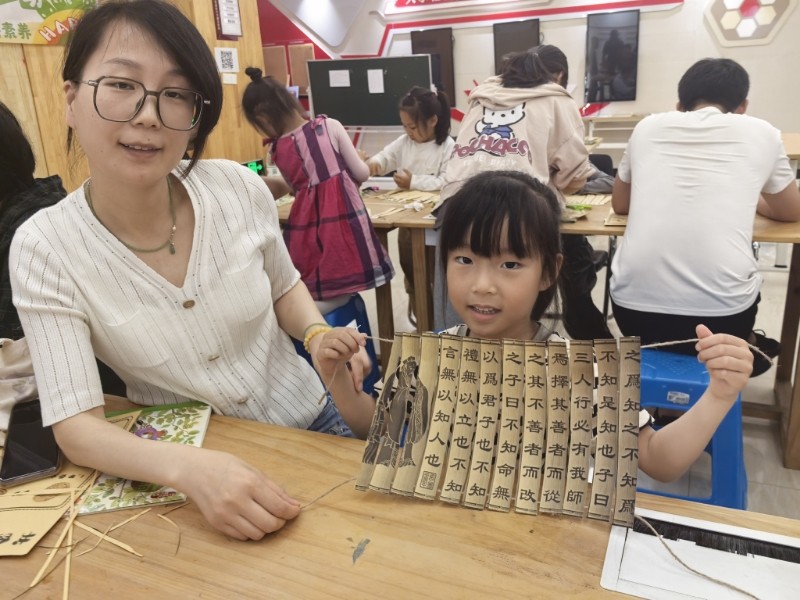 为深化体验,活动特别设置古法竹简制作环节。居民们将牛皮纸裁作竖条,以麻绳串联成册,亲手复原“韦编三绝”的装帧技艺。一位家长感慨:“看似简单的制作过程制作起来挺不容易的,今天才真正懂了‘书香’的来之不易。”
