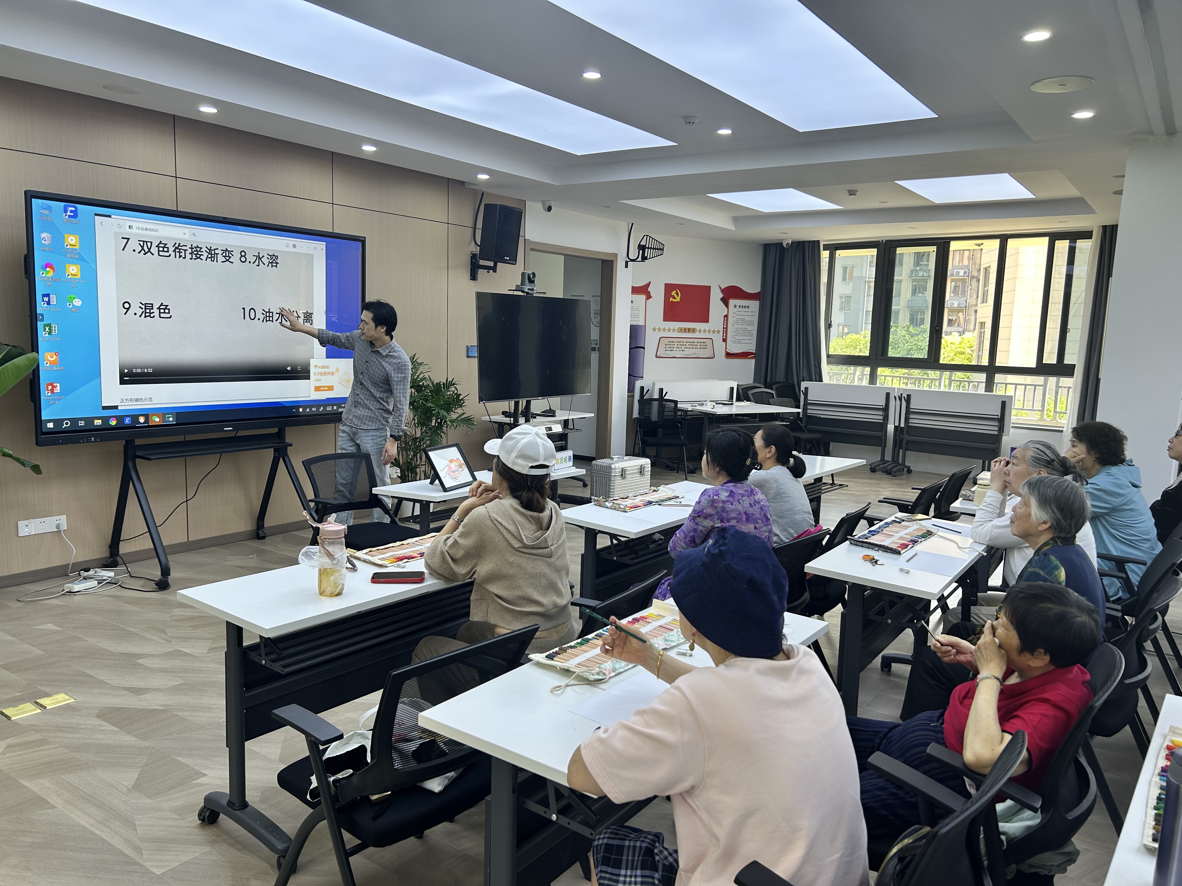 他向学员们介绍参与彩铅绘画的过程中有着诸多益处。首先,它能够锻炼手部精细动作能力,促进大脑血液循环,延缓认知功能衰退。其次,通过专注于创作过程,可以有效地减轻压力、缓解焦虑情绪,提升心理健康水平。