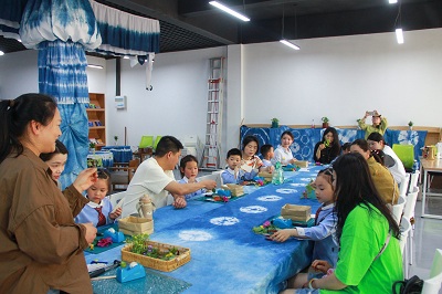 为了打造具有庄桥特色的“城市书房”,街道还引入了江北区级非遗植物染传承人的团队参与书房运营,在书房内加入了大量植物染布、玩偶的陈列,并在正式开放这天,开展了一场“宁波市树樟树植物染书签DIY”世界读书日主题活动。宁波市江北区博悦幼儿园的7组亲子家庭在樟树开花的时节,拾取园内的樟树落叶落花和其他植物原料,在植物染非遗传承人的指导下,通过锤击敲打的方式提取树叶和花朵中的天然色素,或将植物素材按照自己喜欢的布局,以拼画的形式定格在书签纸上。随后,家长和孩子们选择喜欢的古诗贴纸,用冷裱膜完成装裱,并给书签系上流苏,每个作品都创意满满、独一无二,让孩子们在樟香与书香的交融中,喜欢上了这个优雅的阅读空间。