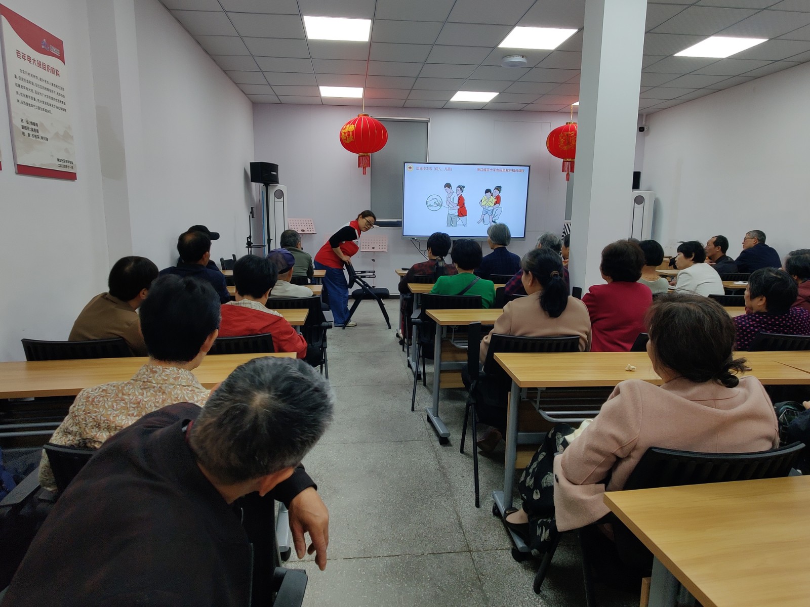 活动现场座无虚席,居民们怀着对急救知识的渴望早早地来到教室。舒慧梅老师以生动形象的语言和实际案例,深入浅出地讲解了异物梗阻、心肺复苏等急救知识。异物卡喉时,每一秒都在与死神赛跑!施救者要站在患者身后,一手握拳,拳眼对准肚脐上方两指处,另一手包住拳头,快速向上向内冲击……居民们边听边模仿动作,现场学习氛围浓厚。舒老师详细讲解了成人、婴儿孕妇的不同施救方法:对清醒成人需从背后环抱腰部,双手握拳冲击上腹部;对婴儿则需头低脚高拍背压胸,避免盲目拍打;对孕妇或肥胖者则采用胸部冲击法随后,舒老师着重讲解了心肺复苏的重要性及操作流程向居民们展示了心肺复苏的正确姿势、按压频率、按压深度以及人工呼吸的技巧等。