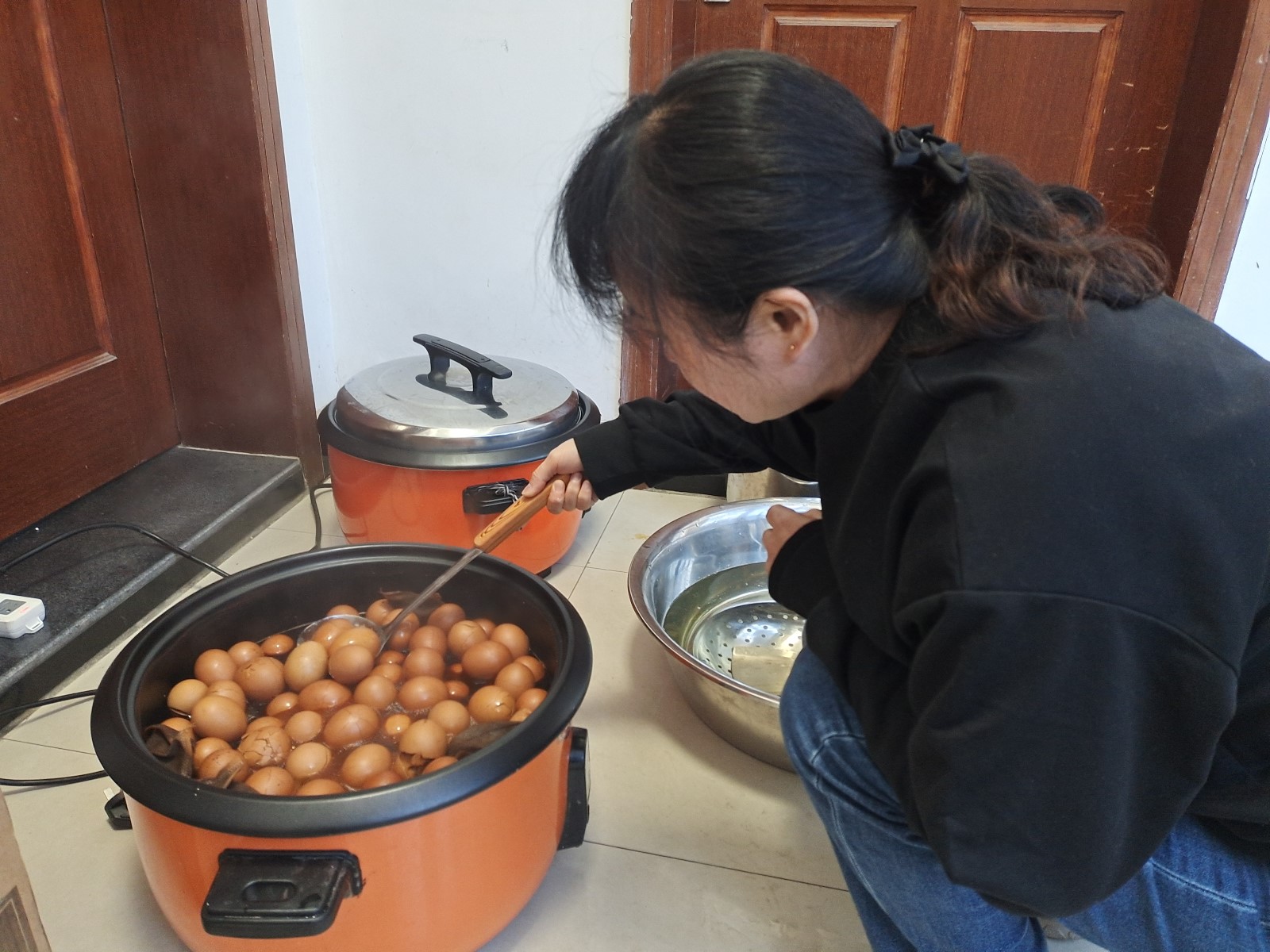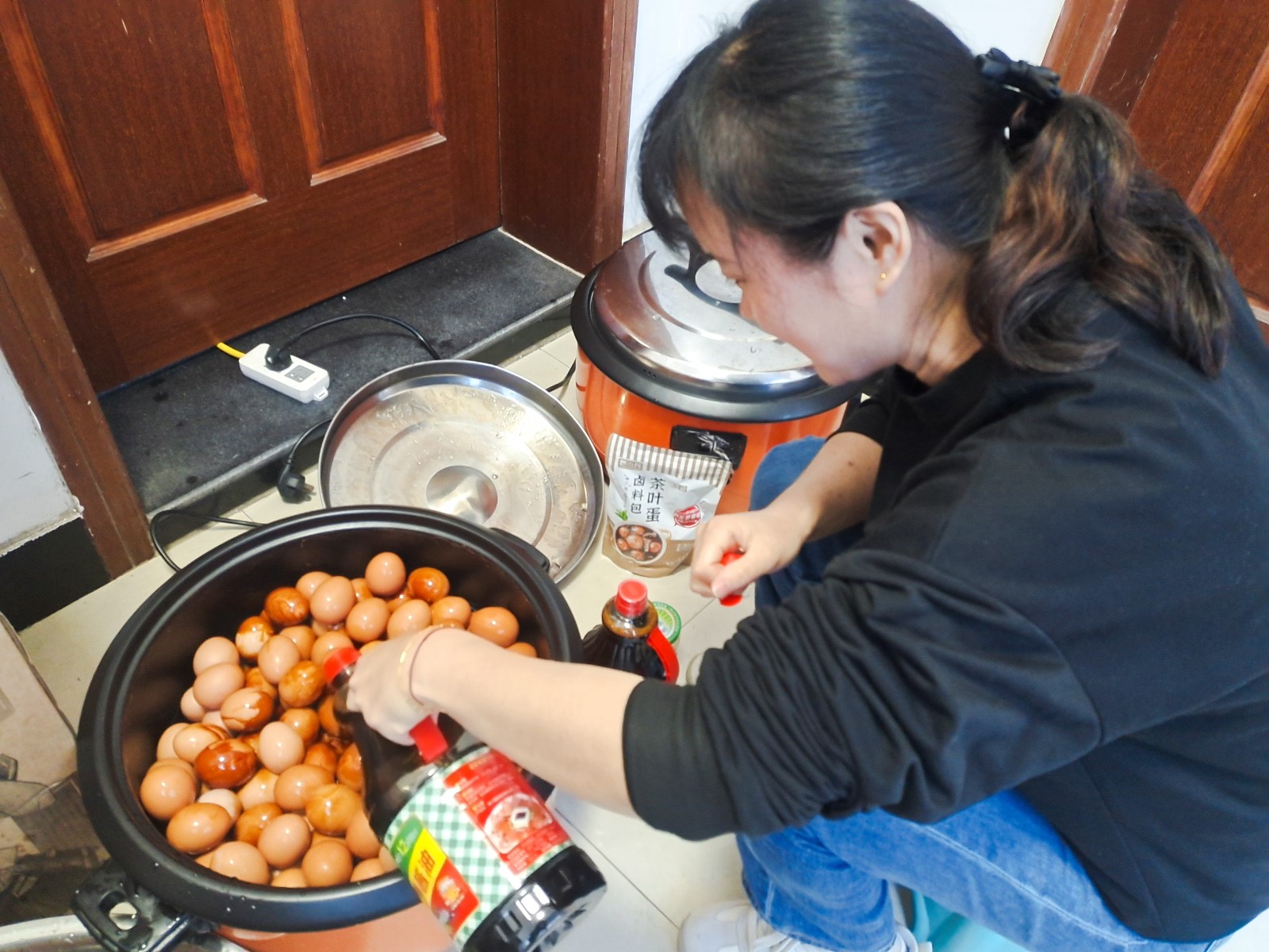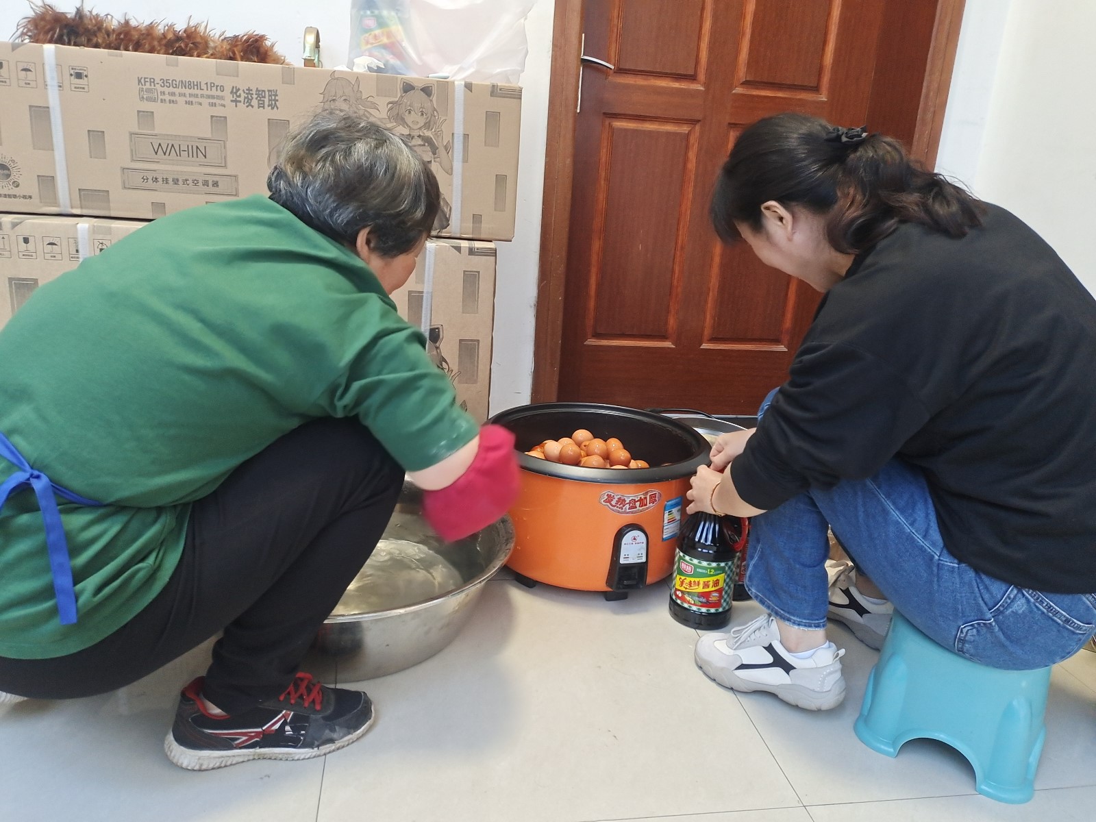 活动现场,工作人员组织楼组长、居民代表、网格员分工合作,将鸡蛋清洗后放入电饭煲中,煮熟后拿出来微微敲碎蛋壳放入锅中,加入酱油、茴香、茶叶等一起煮制,混合着茶香与料香的白雾袅袅升起,锅中的汤汁“咕嘟”作响,不一会活动室中飘香四溢。