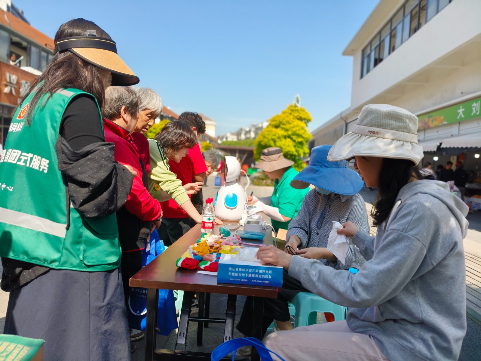 养老政策咨询摊位,小柏家护工作人员用五感设备为居民量血压,耐心答疑解惑,把养老政策讲得明明白白。微信图片_20250429151718.jpg一旁的眼镜清洗摊,网格员操作洗眼镜机器,为居民们清洗眼镜。网格员还带来了社区“织了”钩织社阿姨们的手工蛋套,义卖现场引得不少居民驻足选购。