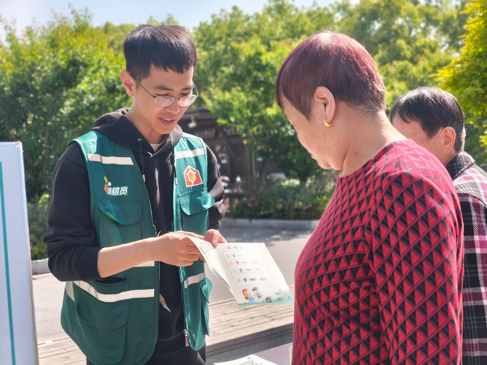宣传摊位上,网格员结合案例、手册,讲解垃圾分类诀窍和防诈反诈要点,提醒居民守护小区环境,捂紧“钱袋子”。
