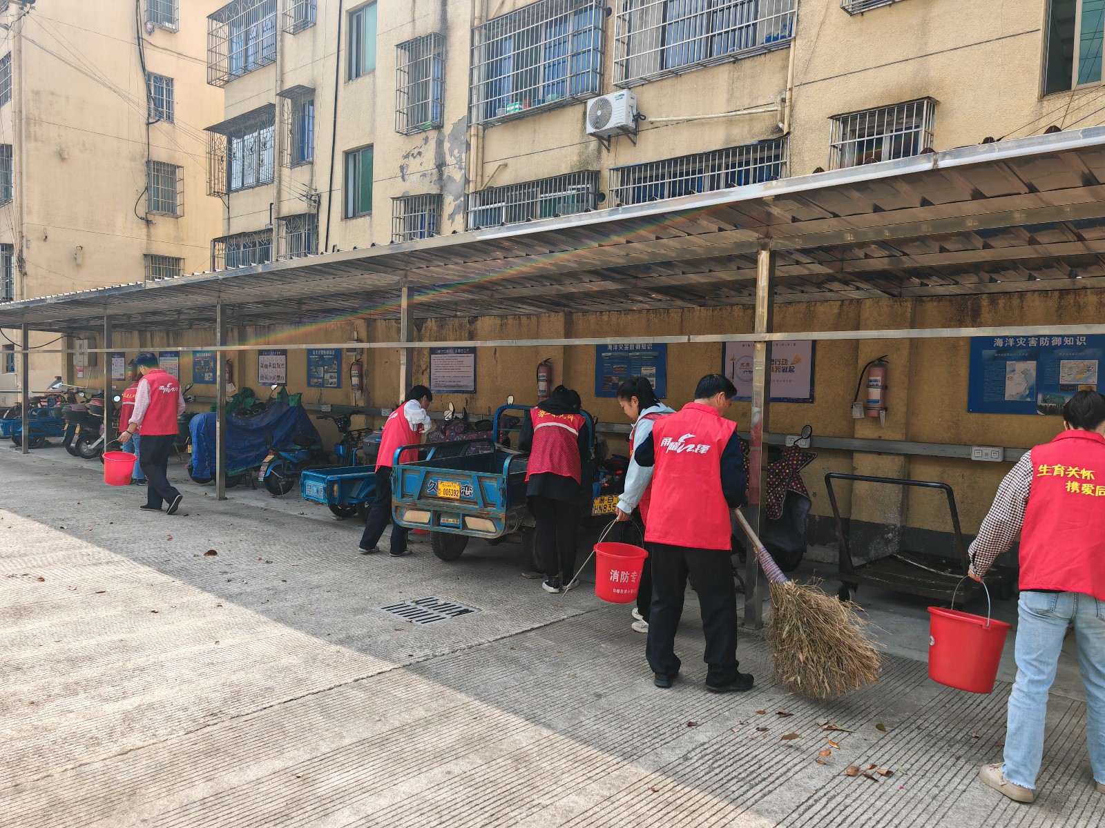 本次活动聚焦辖区部分小区卫生死角进行集中清理,进一步改善社区人居环境。活动现场,20余名志愿者手持扫帚、垃圾夹等清洁工具,分工协作,迅速投身到环境整治行动中。他们分组深入小区绿化带,仔细捡拾烟头、塑料袋、废弃杂物;对楼道卫生死角内堆放的生活杂物、纸屑、包装盒等进行清扫。除清理垃圾外,志愿者们还针对小区电动车乱停乱放问题开展专项整治,主动引导车主规范停车,确保消防通道和公共区域畅通无阻。同时,他们化身环保宣传员,向过往居民发放环保宣传手册,耐心讲解垃圾分类、节能减排等绿色生活知识,倡导大家从日常点滴做起,共同守护美好家园。