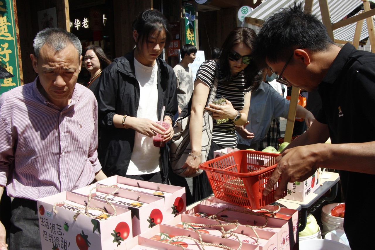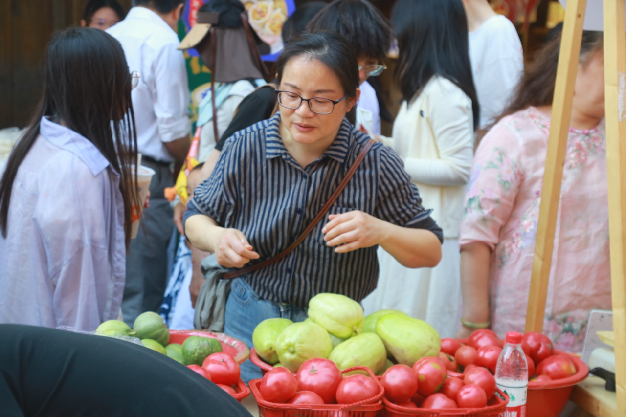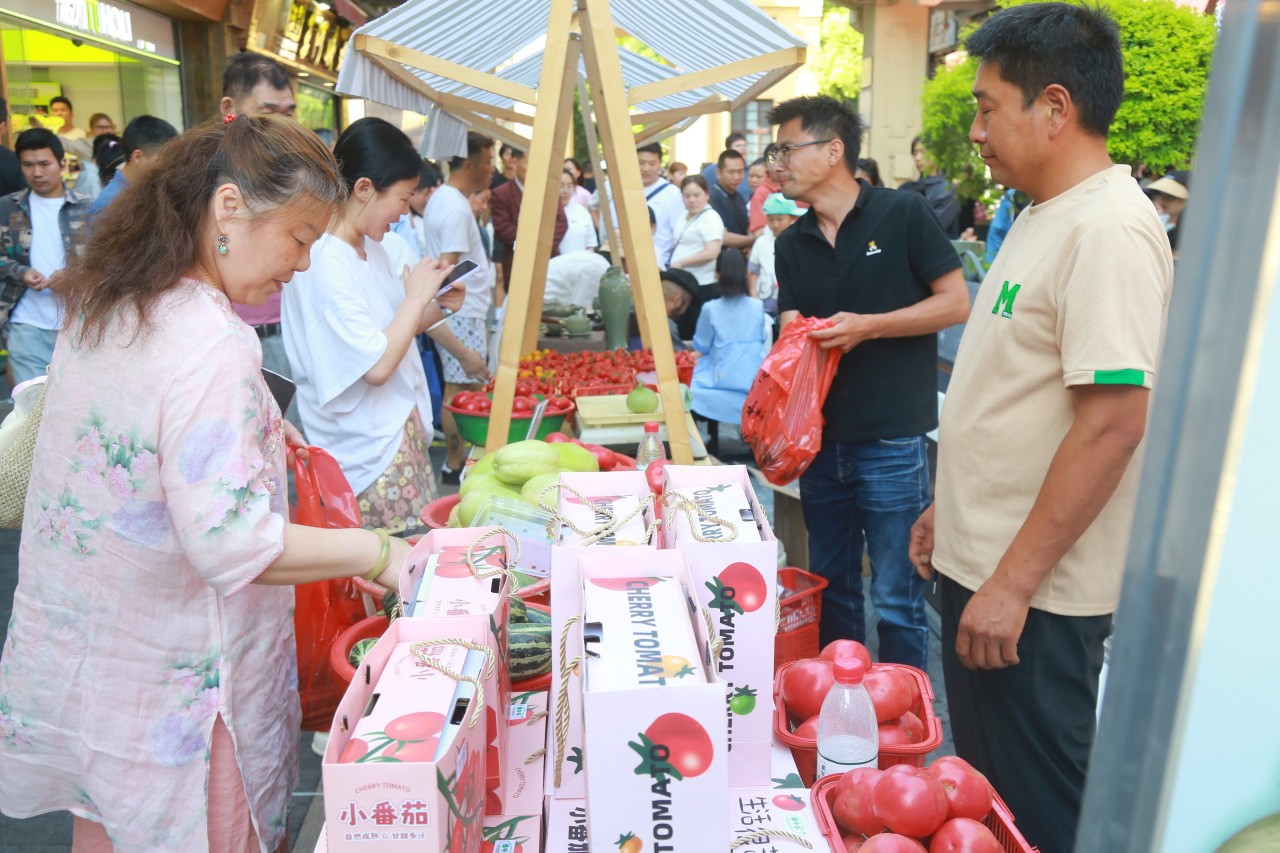活动现场,产品展销区人气火爆。来自明美“6+X”共富工坊的精品小番茄、甜瓜以饱满多汁成为“明星产品”,吸引现场市民游客争相品尝购买。其背后是桥头镇创新推行的“一户一棚”帮扶项目——利用残疾人农户闲置农田,免费为他们搭建蔬菜大棚,提供良种、化肥、技术指导、销路等一系列帮扶措施,带动他们走上劳动致富道路。来自天时利共富工坊的杨梅酥、杨梅汁等特色农产品亦备受青睐。金黄酥皮包裹着用杨梅熬制的果酱,酥脆的黄油香气和酸甜果香在唇齿间漫溢。鲜甜的杨梅汁则还原了鲜果本味。近年来,天时利共富工坊不断延伸杨梅产业链,为桥头特色杨梅产业发展增添了“新引擎”。