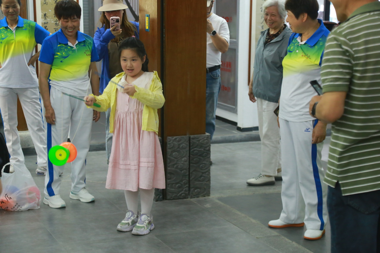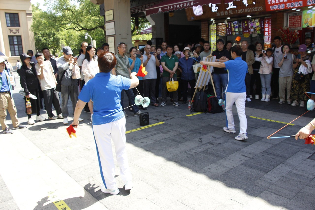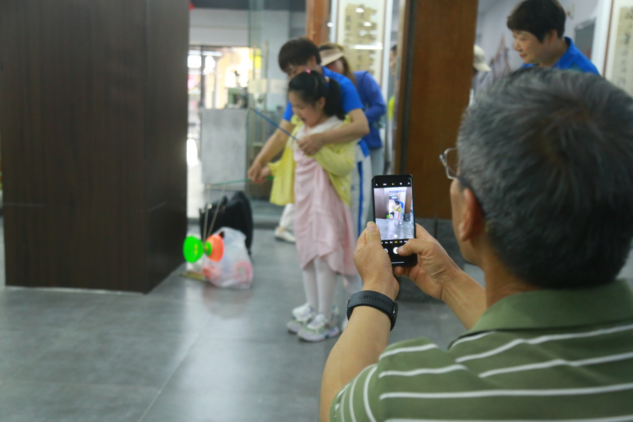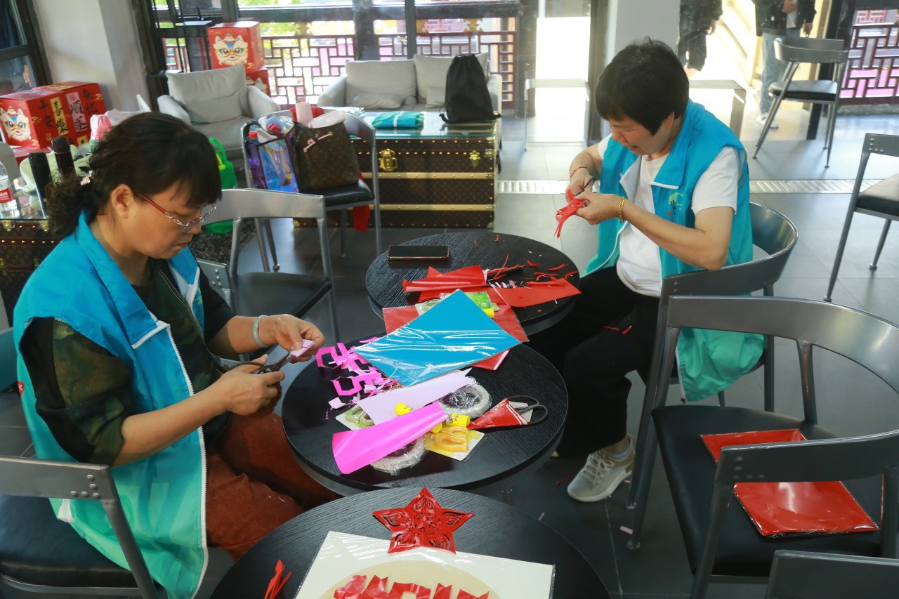 桥头镇心贴心共富工坊团队的编织摊位同样吸引了许多游客。他们一边售卖造型各异的花篮,一边现场演示编织步骤。这些浸润着温度的手工艺品,让传统技艺变得可触可感。剪纸和空竹教学摊位前挤满了跃跃欲试的游客。剪纸摊位的长桌上铺满红纸,潭河沿村剪纸爱好者们巧手生花,不一会儿就剪出了许多花样。空竹摊位旁,几个市民跟着桥头镇空竹队的老师甩绳发力,空竹忽高忽低地嗡鸣旋转。简单的传统技艺,在此刻成了连接传统与现代的欢乐纽带。