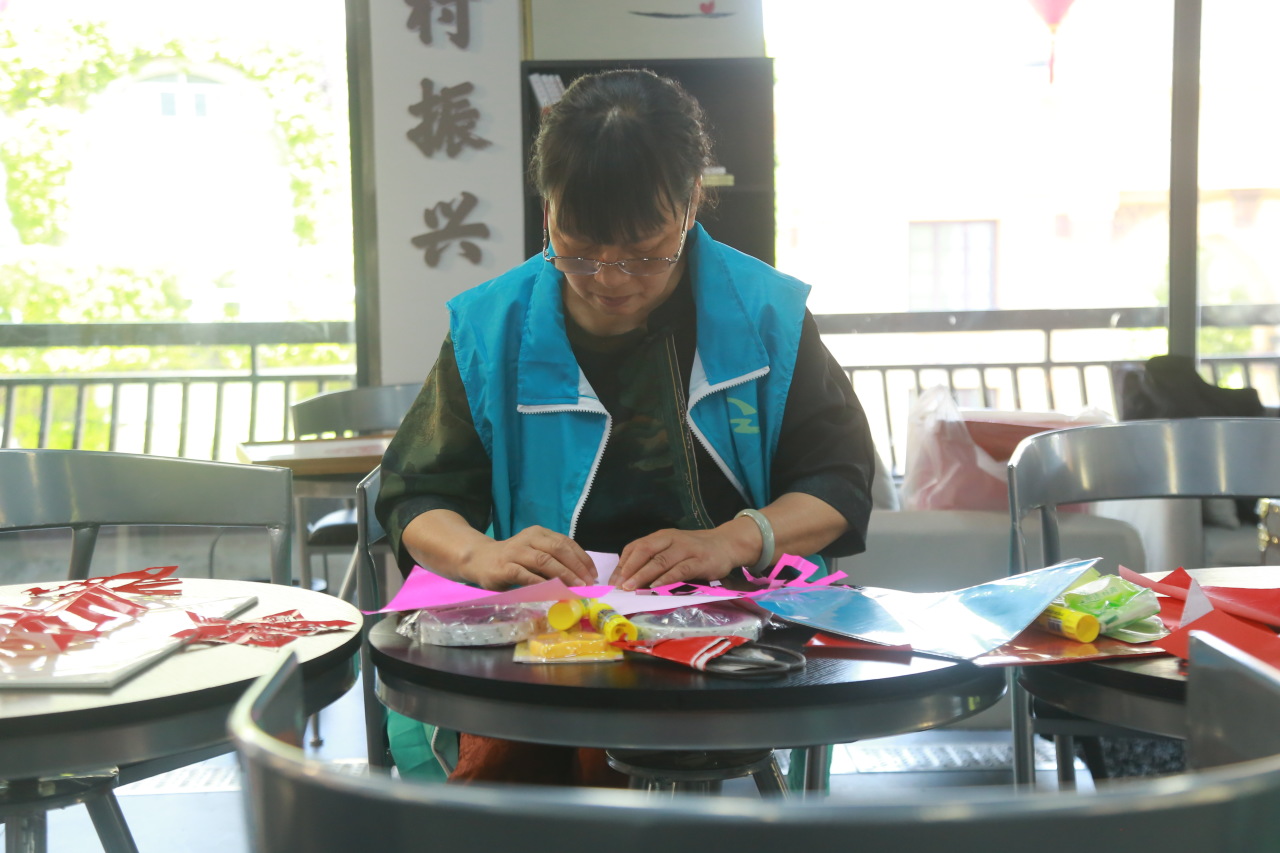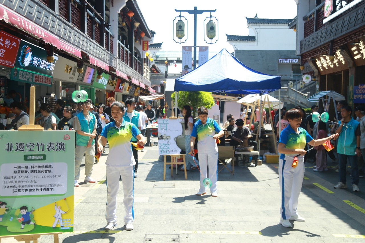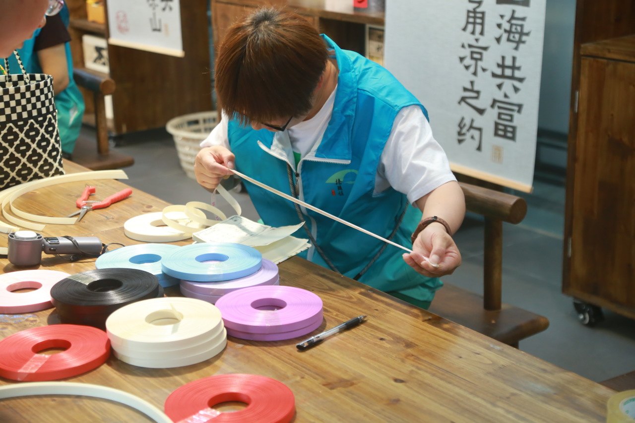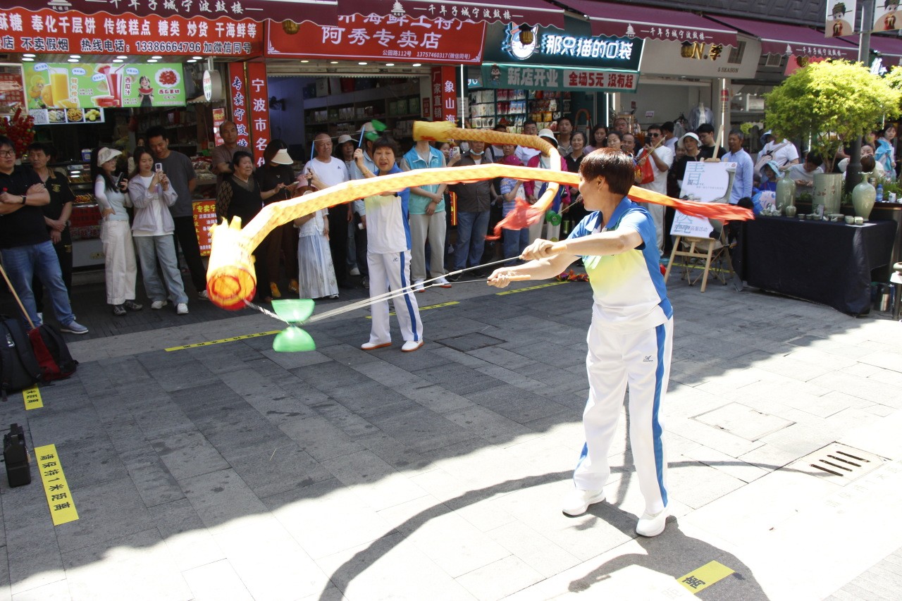 桥头镇心贴心共富工坊团队的编织摊位同样吸引了许多游客。他们一边售卖造型各异的花篮,一边现场演示编织步骤。这些浸润着温度的手工艺品,让传统技艺变得可触可感。剪纸和空竹教学摊位前挤满了跃跃欲试的游客。剪纸摊位的长桌上铺满红纸,潭河沿村剪纸爱好者们巧手生花,不一会儿就剪出了许多花样。空竹摊位旁,几个市民跟着桥头镇空竹队的老师甩绳发力,空竹忽高忽低地嗡鸣旋转。简单的传统技艺,在此刻成了连接传统与现代的欢乐纽带。