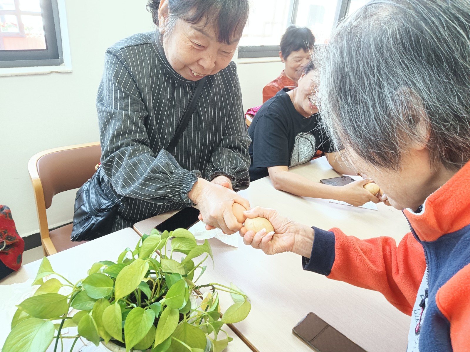 立夏是二十四个节气中的第七个节气,也是夏季的第一个节气,标志着夏季的开始。活动以立夏传统习俗为核心,设置了“退休工人斗蛋大赛”,“巧手编制蛋兜”以及“上门慰问高龄老人”三个环节。斗蛋环节由三十余人先两两分组展开比赛,获胜者再进行第二第三轮,经过多轮刺激的切磋,居民姜阿姨摘得桂冠,成为了今年的斗蛋王。随后,由社区志愿者现场教授大家编织五彩蛋兜,大家互帮互助,有的居民还巧妙在蛋套上增加了流苏,美不收胜