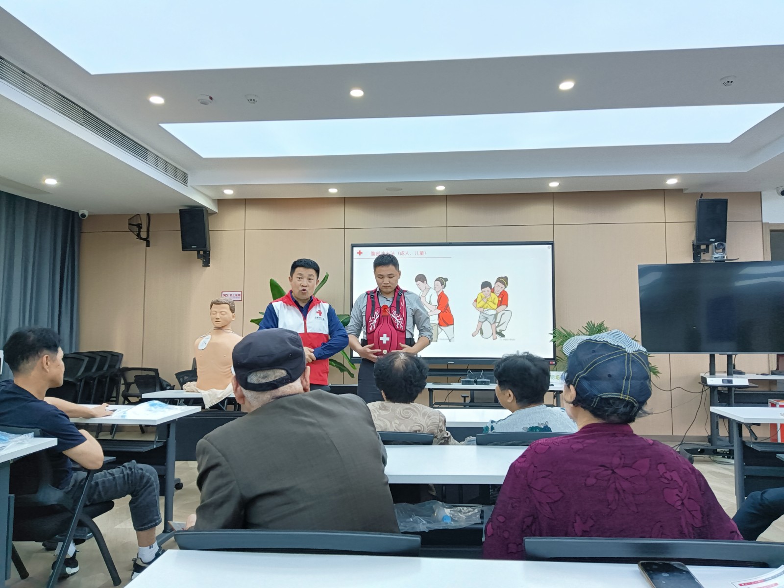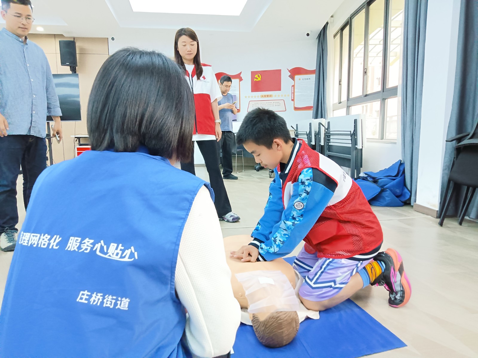 活动分为急救知识讲座,实操演示与互动两部分。在急救知识讲座中,区红十字会的老师讲解了心肺复苏、气道异物梗阻、烫伤、止血包扎等几个常见的急救场景在实操演示与互动中,老师利用人体模型、AED训练机和海姆立克马甲为大家演示心肺复苏(CPR)和海姆立克急救法来自三个社区、持有红十字初级救护员证的几名网格员,协助志愿者老师完成了此次互动教学,帮助居民完成心肺复苏、海姆立克急救,让居民们的急救动作更规范。