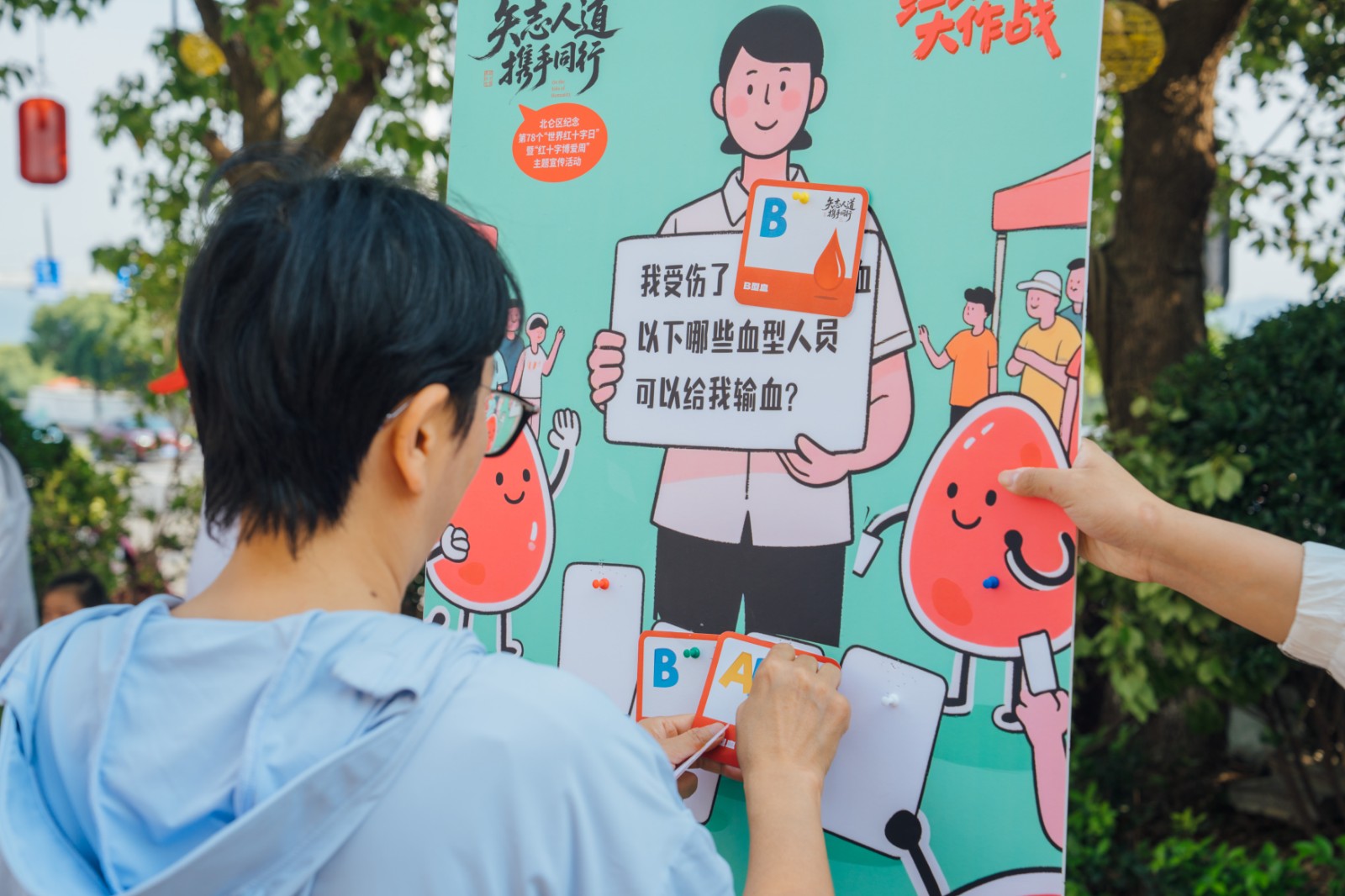人道打卡游戏区更是吸引了众多亲子家庭的参与。“人道小猎手”、“急救小卫士”、“‘救’你知道”知识大转盘以及“红细胞大作战”等游戏,不仅让孩子们学习了红十字基本知识、急救技能和献血知识,还增进了亲子间的情感交流,营造了和谐温馨的家庭氛围。孩子们在家长的陪伴下,积极参与游戏,集章兑换通关好物,现场充满了欢声笑语。