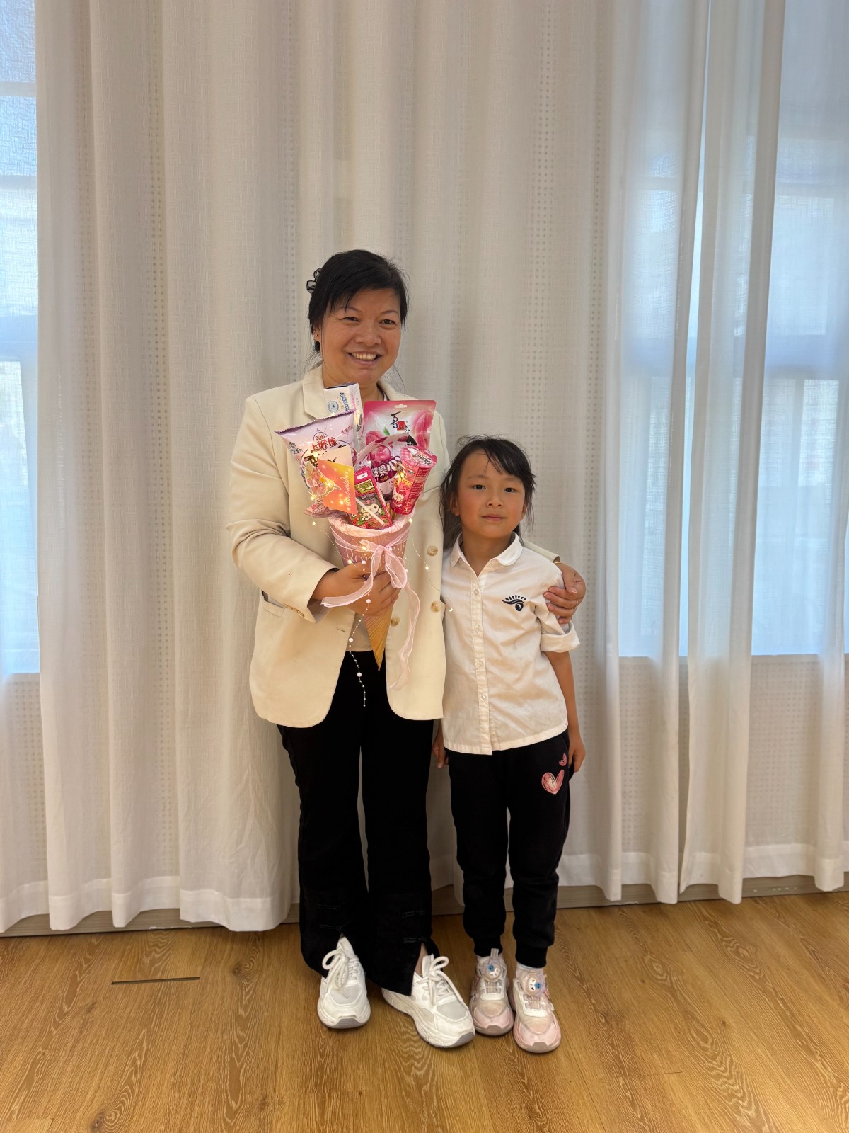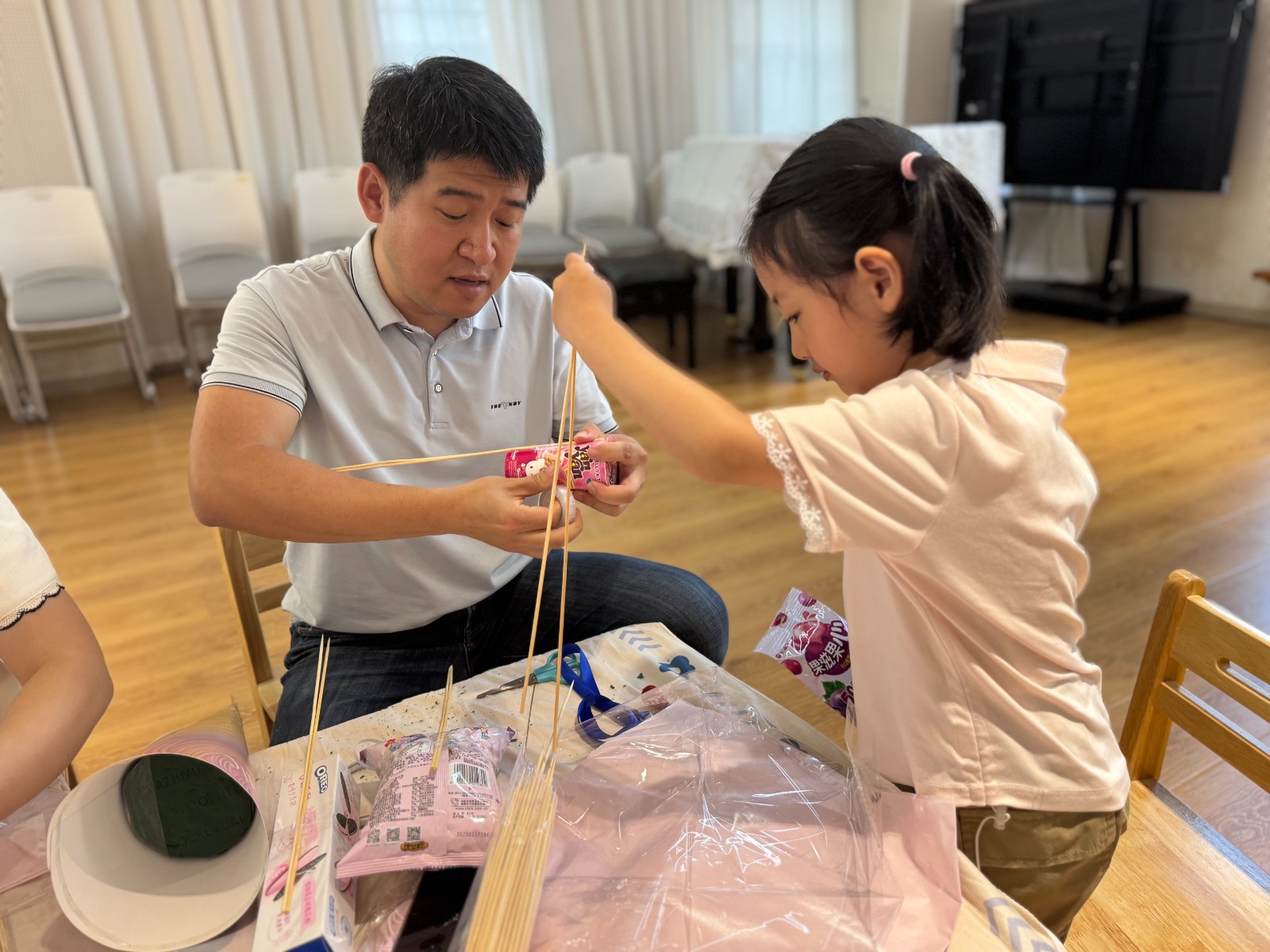 在备受期待的零食花束制作环节,色彩缤纷的包装纸、各种零食与灯带、丝带整齐排列,点燃孩子们的热情。社区巾帼志愿者庄女士、侨眷侨属志愿者江阿姨通过现场演示,详细讲解“波浪褶皱技巧”、零食花束固定等制作秘诀。活动现场家长与孩子默契配合:爸爸与孩子一起缠绕丝带,妈妈引导孩子摆放零食造型。捧着孩子制作的零食花束,家长王女士感慨:“平时工作忙很少静心陪孩子,今天发现女儿动手能力比我想象中强好多。”活动结束后,社区网格员还向大家宣传了《未成年人保护法》、《反家庭暴力法》以及垃圾分类宣传等,增强家庭成员的居住幸福感和维护自身权益的能力。