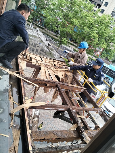 当天,网格员协助物业立即协调专业施工队伍到场评估,在拆除了外部木质部件后,确认了屋檐内部铁质构件存在严重锈蚀松动问题,随时都有二次坠落的风险,当即决定拆除工作刻不容缓。在多方联动配合下,半天内完成了整体拆除及残留物清理,彻底消除隐患。随后,网格员督促商户加强门头的安全检查,将该点位纳入网格重点巡查清单,定期回访复查,通过案例宣传增强商户对“门前三包”责任及定期自查设施安全的意识。