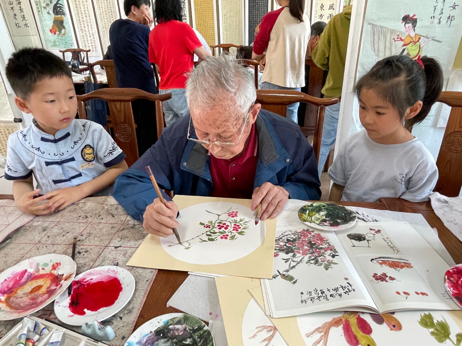 活动现场,老学员们早早准备好宣纸、毛笔、颜料,耐心地为孩子们讲解握笔姿势与绘画技巧。“小朋友们看,画花朵时要轻轻勾勒线条,就像给花瓣穿上漂亮的裙子。”戴源鑫爷爷温和地示范着,孩子们则睁着好奇的大眼睛,模仿着老爷爷的动作,稚嫩的笔触在纸上留下歪歪扭扭却充满童趣的图案。