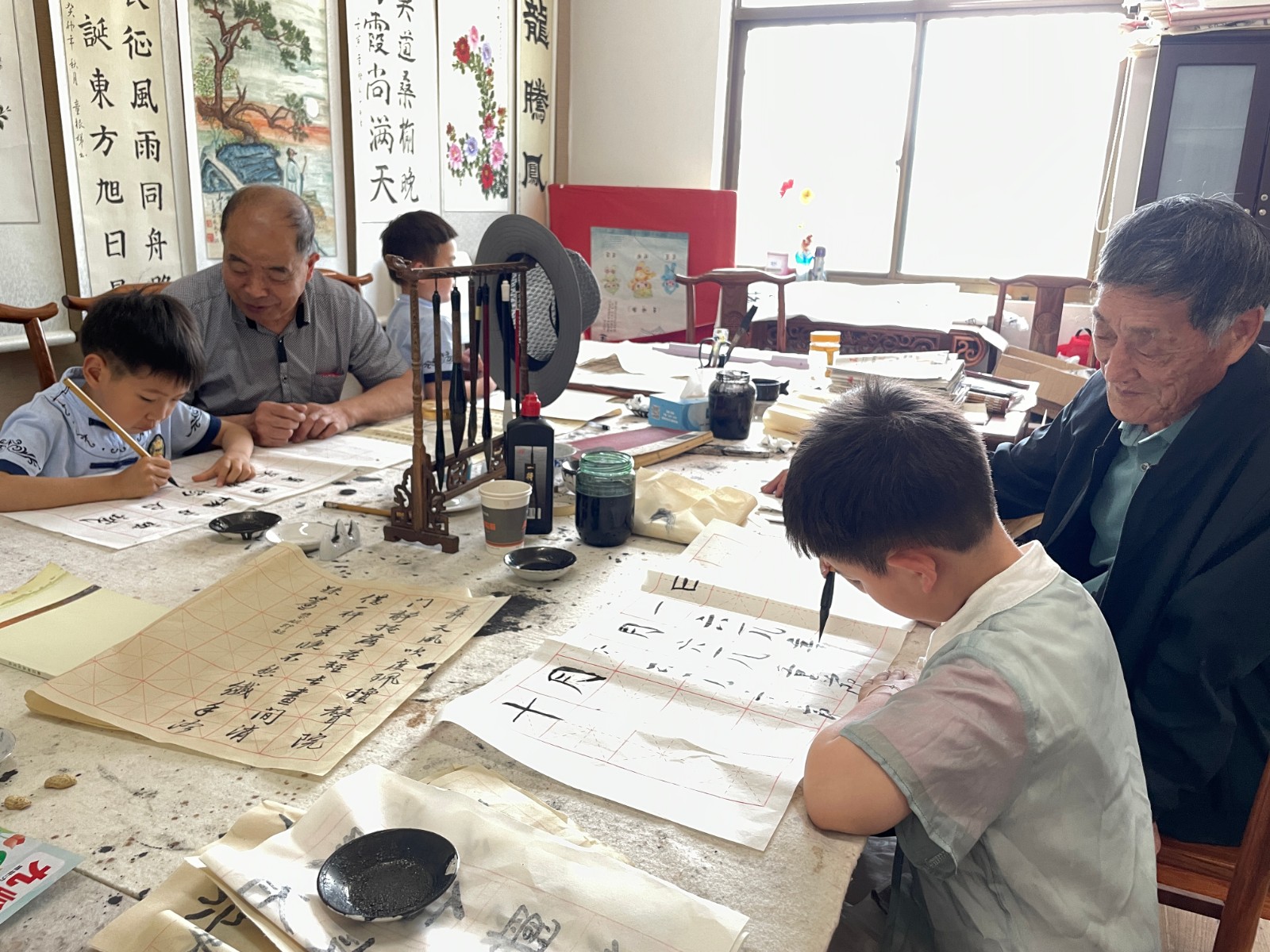 “六一”儿童节来临之际,由霞浦成校和陈华浦社区联合举办的老少书画活动在霞浦老年学校陈华浦教学点(书画班)开展。白发苍苍的书画班老学员们与陈华浦幼儿园天真烂漫的孩子们相聚一堂,以笔为媒、以墨传情,在传统国粹艺术的交流中搭建起跨越代际的桥梁。