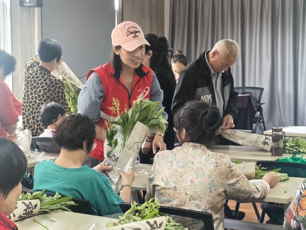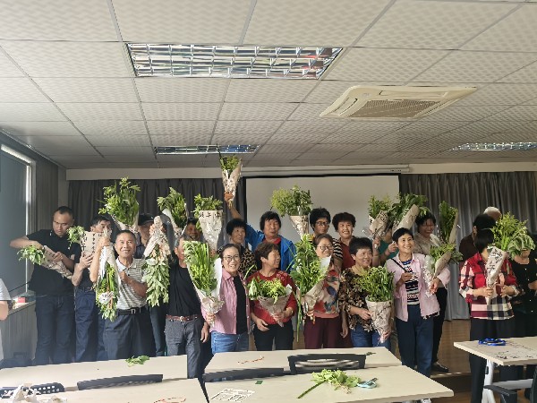 “五月五,过端午,悬艾草,插香蒲……”活动现场,社区教育志愿者以民谣为引,通过互动问答与趣味讲解,层层揭开节日密码:从屈原投江的历史典故到夏至驱疫的民俗渊源,从 “蒲剑斩邪” 的象征意象到艾草 “避毒虫、安神魂” 的实用智慧,让参与者深刻理解门挂作为 “文化符号” 与 “生活器物” 的双重价值。随后,志愿者化身技艺导师,将艾草、菖蒲、香囊等材料一一分发,并耐心讲解制作要领:“先把艾草用螺旋手法打好,菖蒲叶、玉簪叶加在下方位置,加以香囊,再点缀上‘端午安康’的小卡片,系上创意十足的小挂饰。”在志愿者的指导下,居民们按照步骤开始制作,不一会儿,一个个精美的挂件就呈现在大家的面前,大家手持亲手制作的作品,互道一声“端午安康”,现场其乐融融。