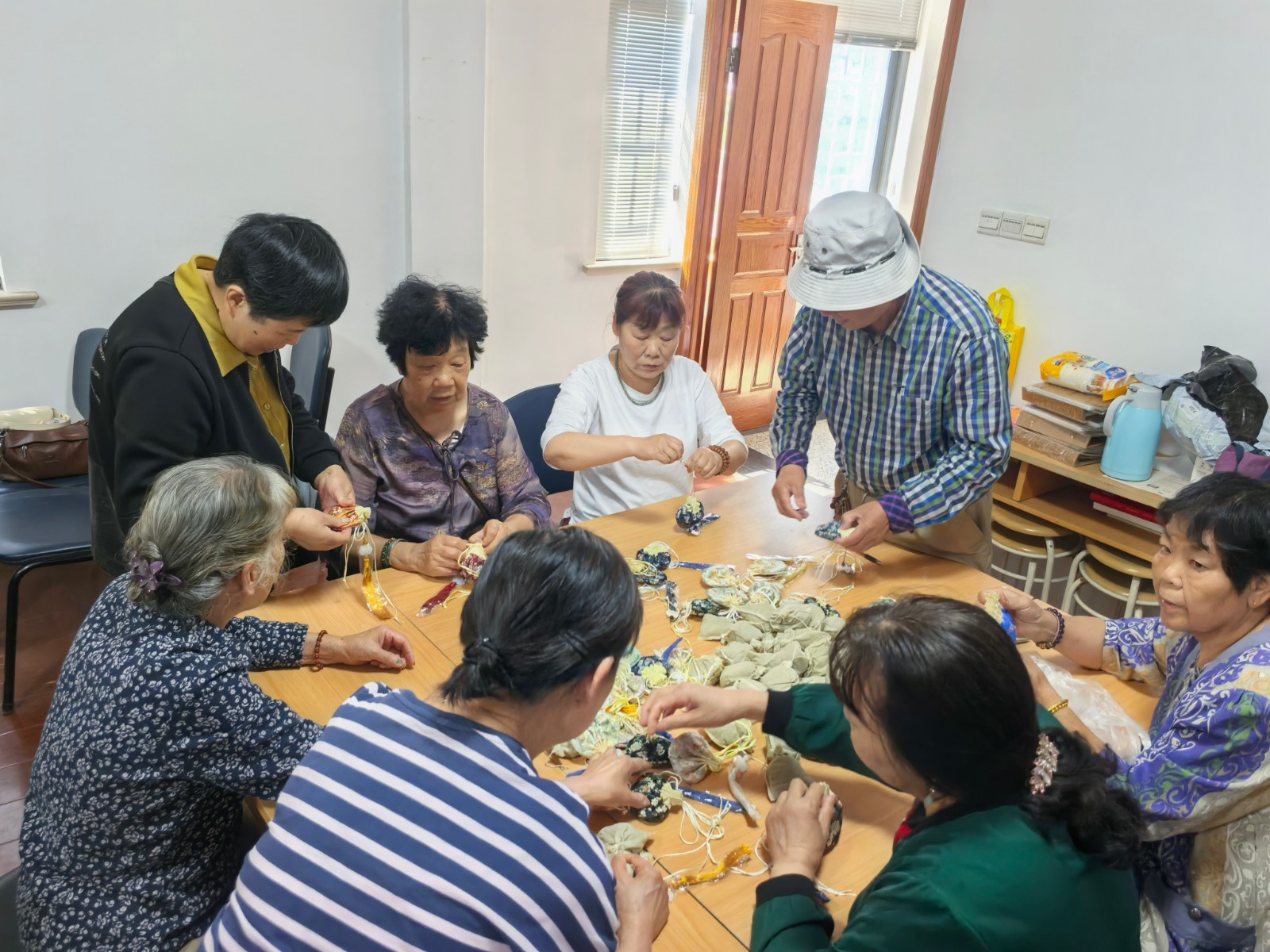活动室的另一头也弥漫着草本清香,社区志愿者正向居民讲解端午挂艾传统。艾草形似宝剑可驱邪,菖蒲如鞭能祛毒,佩香囊源自衣冠疗法......随着讲解,居民们将新鲜艾草、菖蒲叶搭配在一起,用红固定系紧挂在家门前以祈福健康平安。居民还一起制作了一份悬挂于社区门口这比单家独户的装饰更有意义,象征我们同气连枝。居民代表鲁招娣感慨道。
