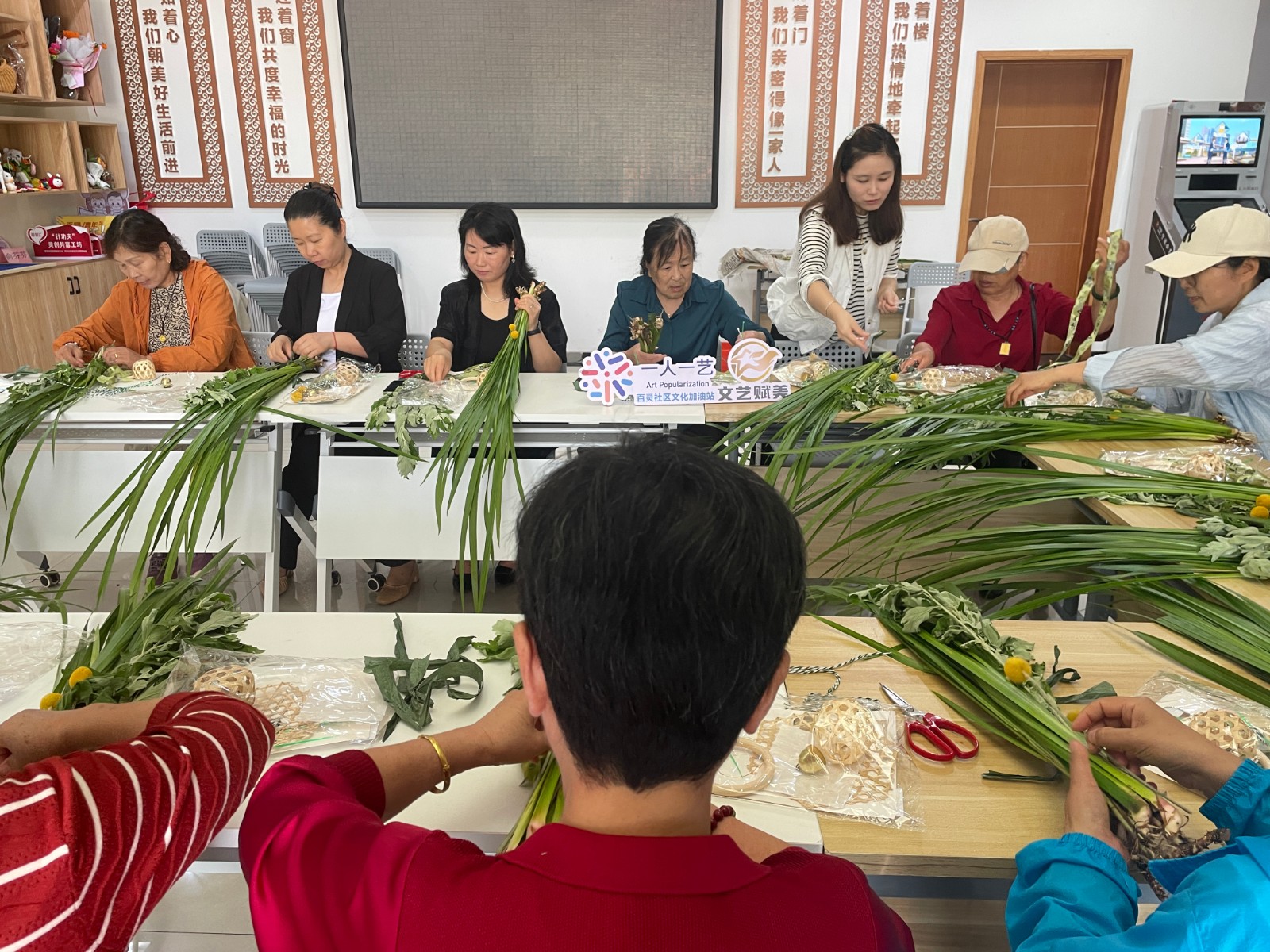 “端午节挂艾草是自古以来的传统,艾草不仅寓意驱邪祈福,其清香还能净化空气。”社区教育志愿者一边讲解,一边展示艾草、菖蒲、五彩绳等材料。随后,志愿者详细演示了艾草花束的制作步骤,从如何捆扎到装饰搭配,居民们听得津津有味,跃跃欲试。在DIY环节,大家纷纷动手制作属于自己的端午花束。有的居民手法娴熟,迅速绑好艾草和菖蒲,再配上干花和彩绳,一束精美的花束很快成型;有的居民则与邻居互相协作,一边聊天一边研究如何搭配更美观。现场欢声笑语不断,艾草的清香弥漫整个活动室,节日氛围格外浓厚。