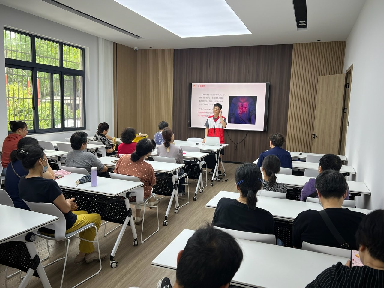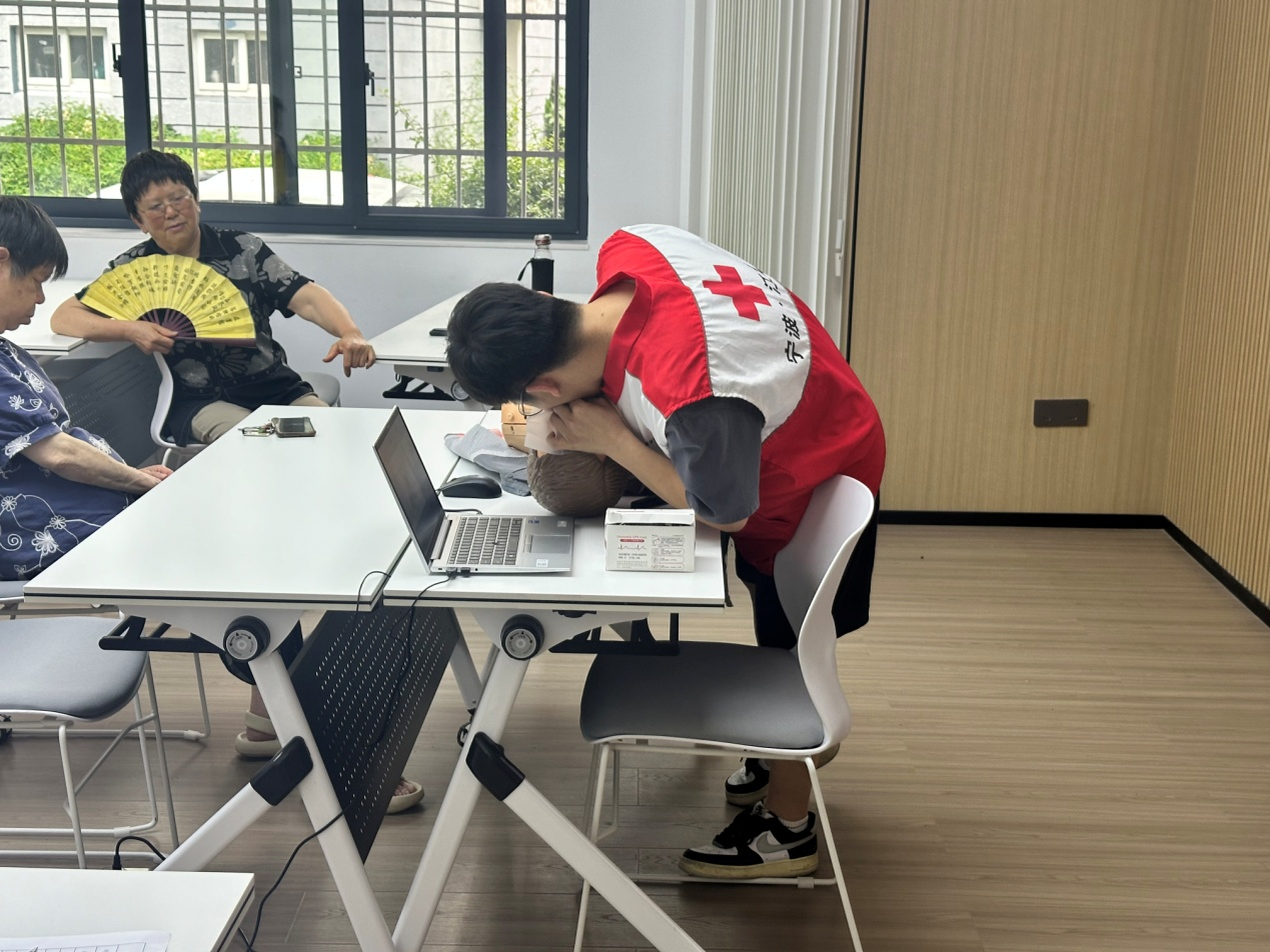 主讲吴医生用通俗易懂的语言讲解着急救要点。“心脏骤停后的4分钟是黄金救援时间。”边说边举起训练用的人体模型开始实操起来,随后居民们轮流上前练习。70岁的陈爷爷刚开始不敢用力,后来在吴医生一次次的指导下,他逐渐掌握了节奏,学会了动作的要领。