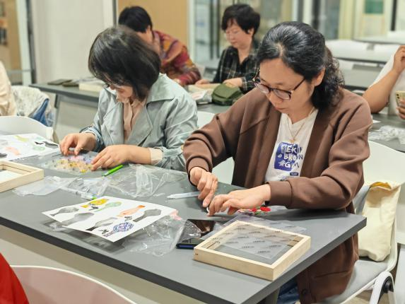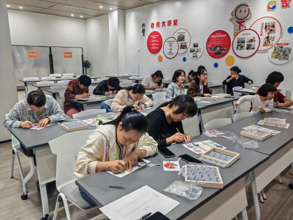 网格员早已准备好了色彩斑斓的珐琅彩图纸、锋利而小巧的刻刀、精美的干花以及透明的相框等制作材料。大家聚坐在一起,等待活动的开始。