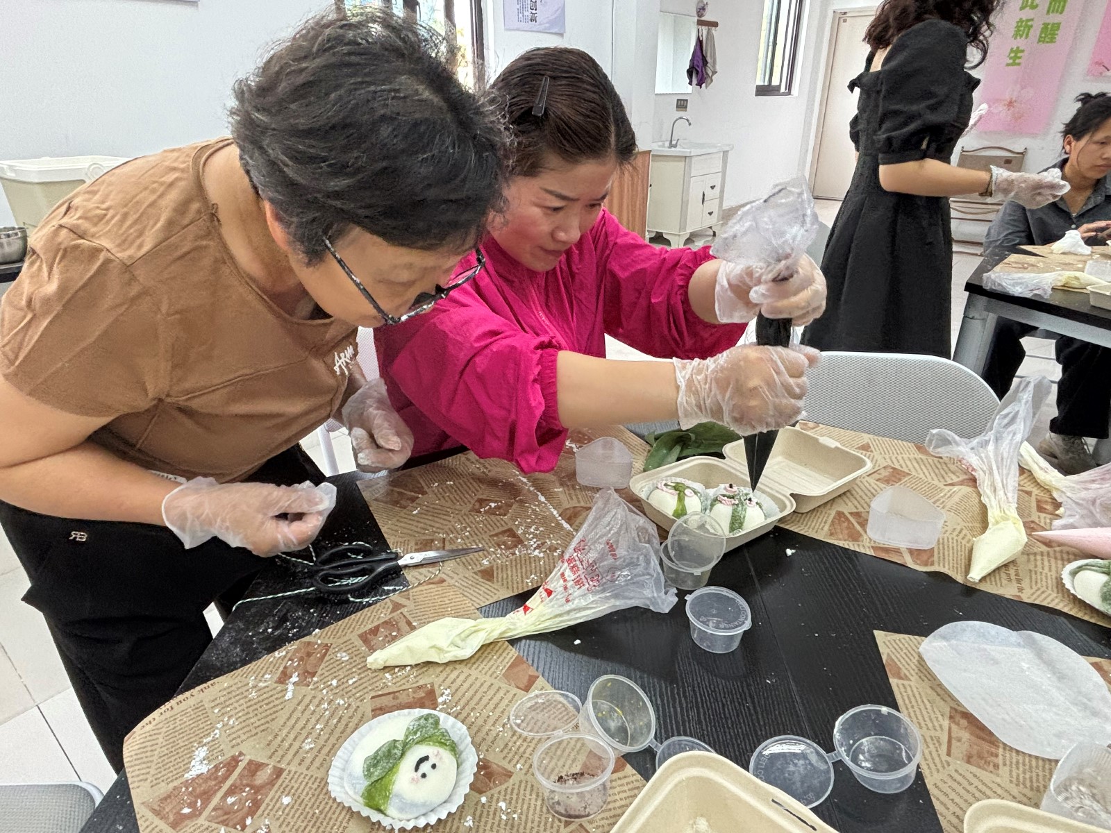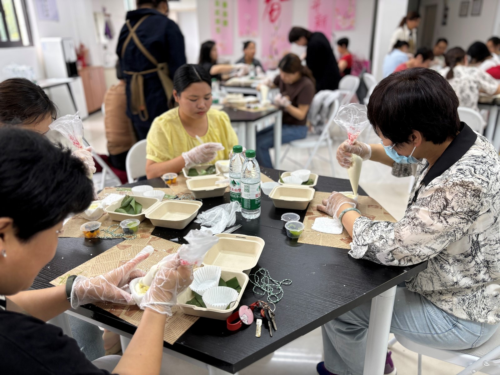 5 月 28 日下午,梅山成校教学点咏梅社区港嫂 “指”造坊第五期活动 ——“糯香新趣,巧手传情”活力揭幕。与往年包传统粽子不同,此次活动以创意十足的粽形雪媚娘为媒,将西式甜品与端午元素巧妙融合,为节日注入了别样的甜蜜趣味。当雪白的糯米皮裹着绵密奶油,化身憨态可掬的“粽宝宝”,一场舌尖上的传统与创新碰撞之旅就此展开。