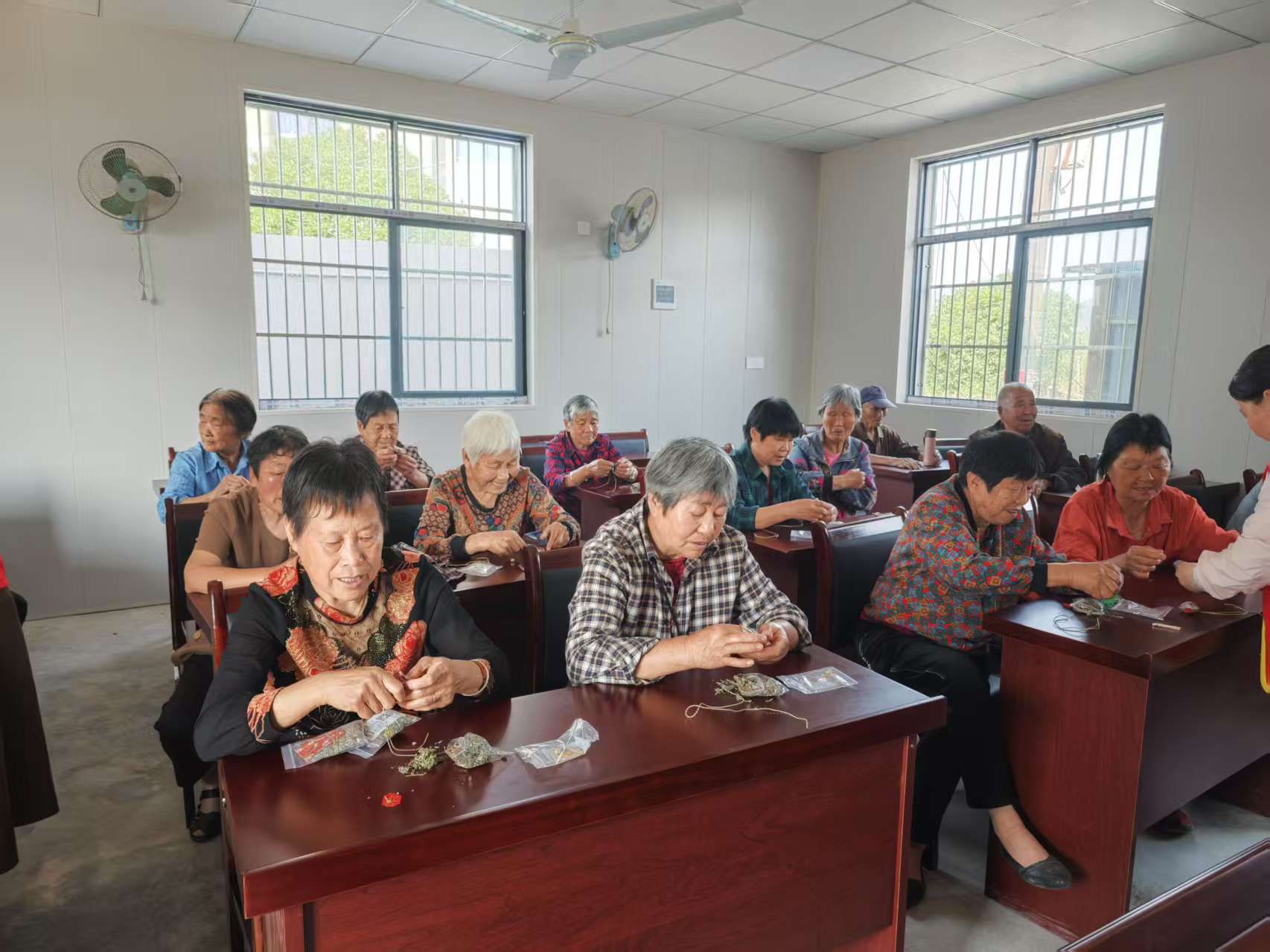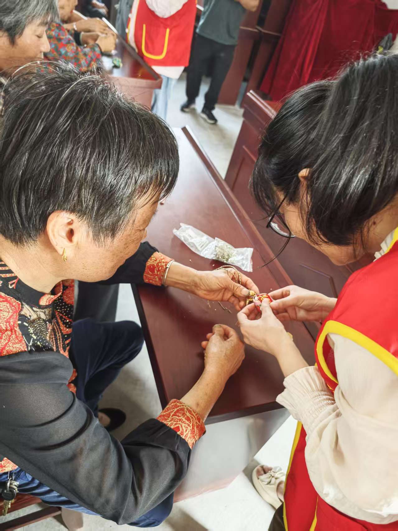活动现场,志愿者化身“文化讲师”,为大家讲述端午香包的起源与发展。制作过程中,村民们围坐交流,分享制作经验与心得。志愿者耐心讲解每一个步骤,连后期如何点缀香包的小物件都细致入微。在老师指导下,一个个精美的香包相继诞生,活动室内艾草香萦绕,温馨美好。