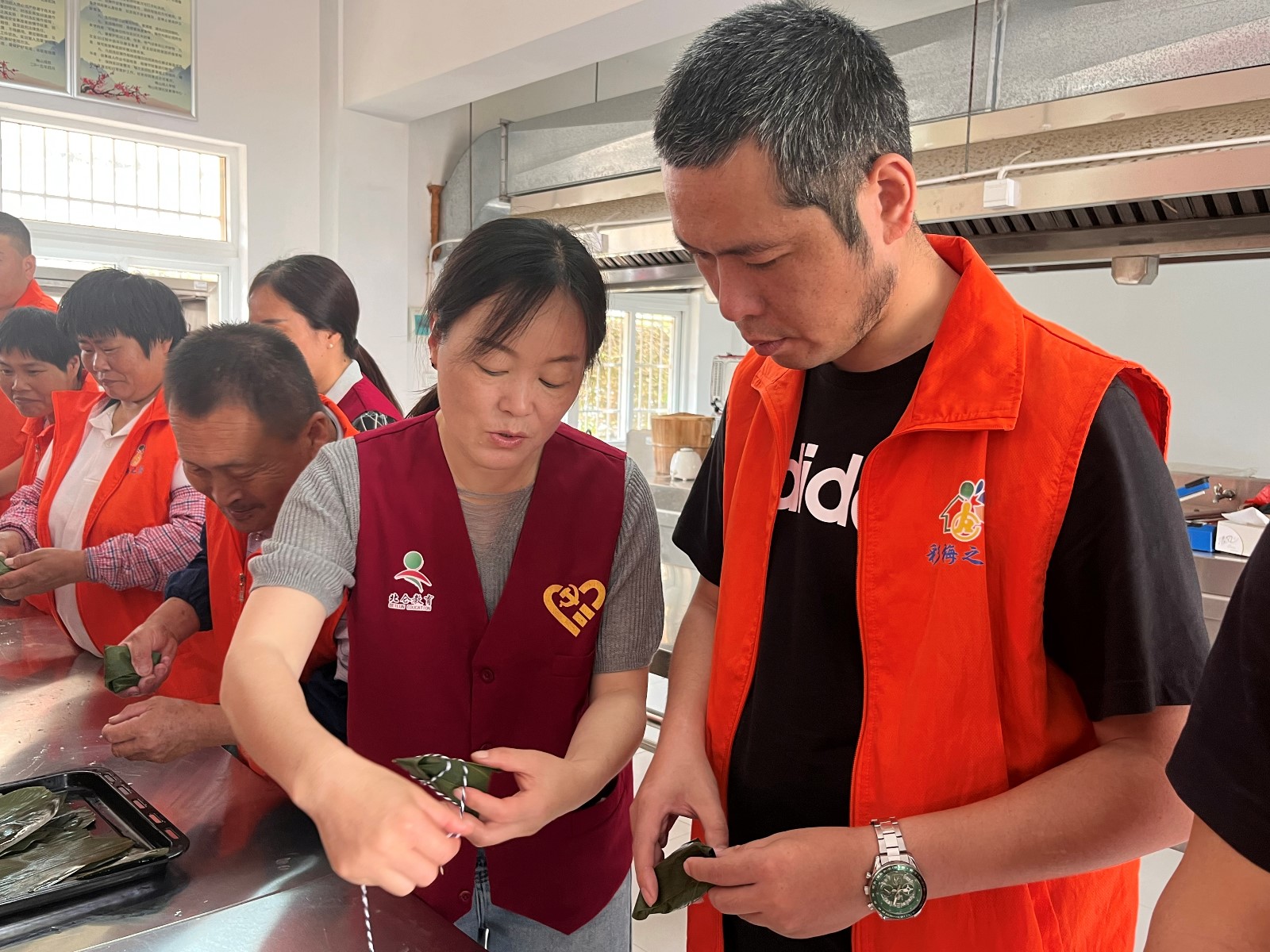 一大早,梅山成校实训室里一片忙碌景象,碧绿的粽叶堆成小山,盆中糯米泛着珍珠般的光泽,肥瘦相间的五花肉浸润在秘制调料中,散发着软糯醇香。“先用双手将粽叶卷成漏斗状,接着将糯米和肉充实压紧,然后将粽叶翻过来封口,再用细绳绕一绕、捆一捆,一个粽子就包好了。”俞师傅耐心地边讲解边操作。柱着拐杖的老王目不转睛地看着,忍不住说:“看起来挺简单,我也试试!”,动手后才知道包粽子还是有点难度的,在包裹的过程中好些托养人员的粽子出现了漏米、不紧实现象,但是他们不气馁,依然兴致勃勃,坚持自己动手,大家互相交流手艺,整个活动现场一片欢声笑语,大家包的不仅是粽子,还是快乐,更把自己对生活的美好期许包了进去。最后一只只形状完整、棱角分明的粽子呈现在大家眼前。
