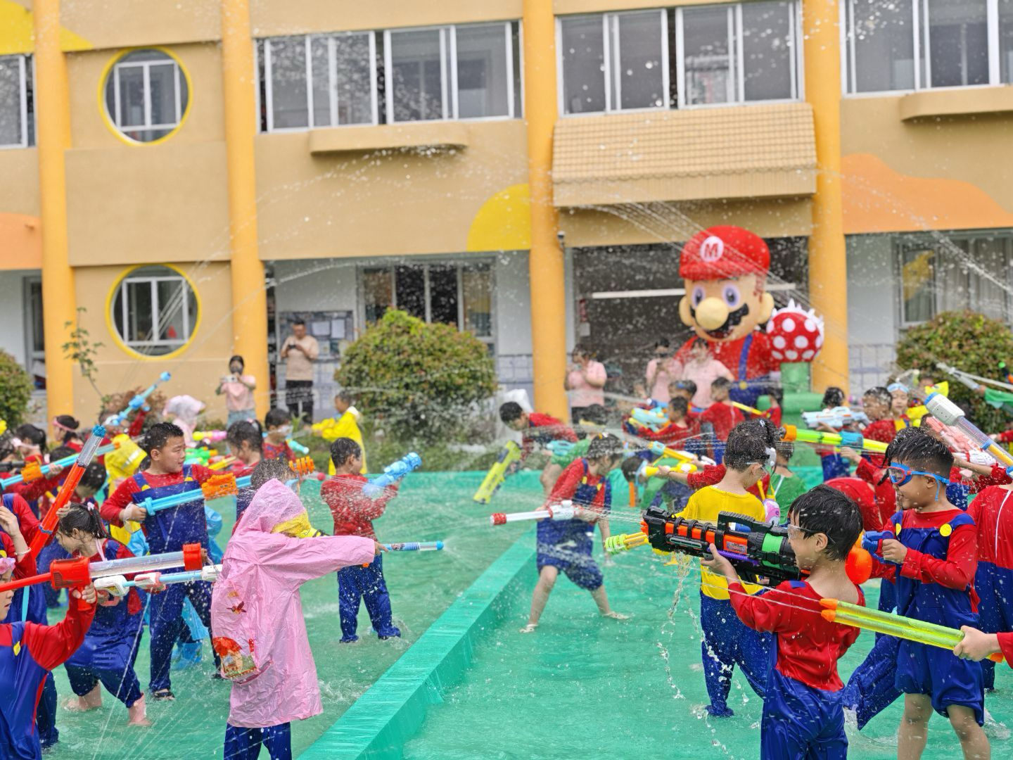随着音乐声响,“水枪大战”正式拉开帷幕!孩子们化身勇敢的“小战士”,背着造型各异的水枪,穿梭在清凉的“战场”。水枪喷出晶莹的水花,在空中交织成绚丽的水幕;孩子们被水淋湿的头发、沾满水珠的笑脸,都成为这场夏日狂欢最生动的注脚。