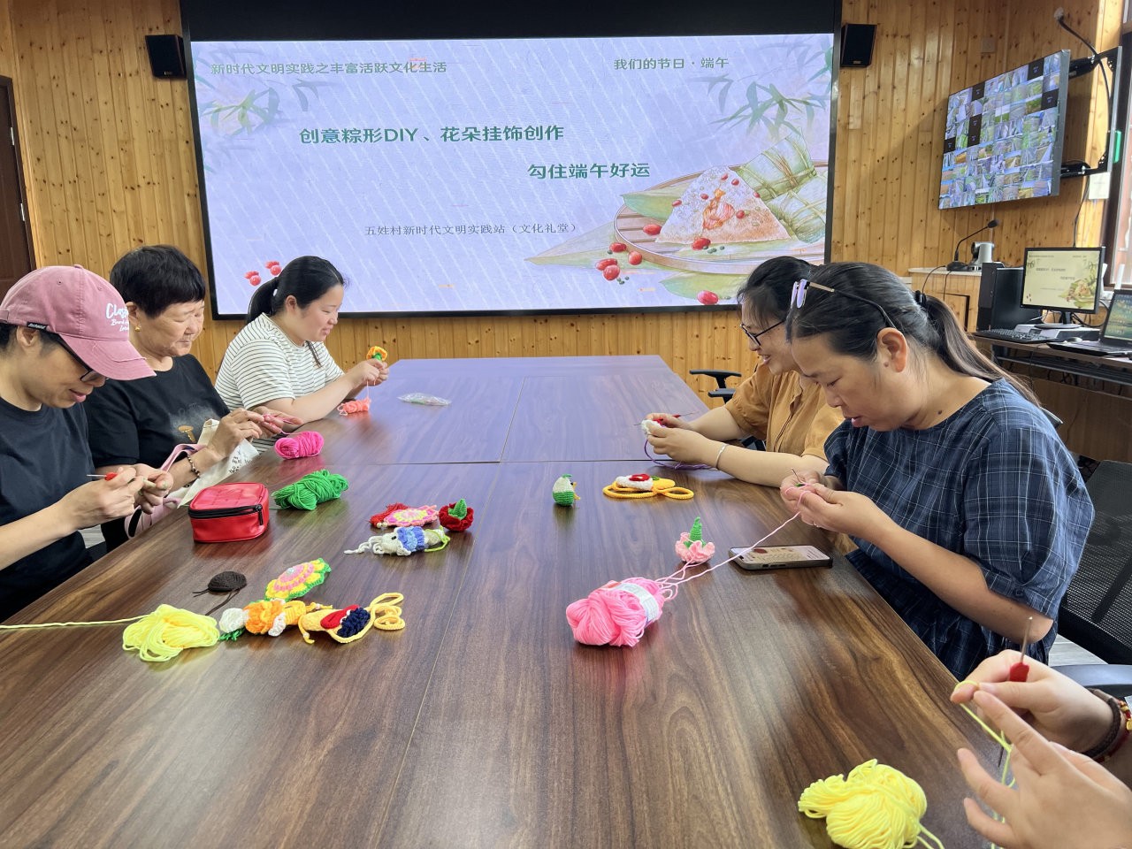 五姓村邀请爱好编织的村民齐聚一堂,参与端午主题手工活动。老师现场示范钩针技法,带领大家用彩色棉线钩织出栩栩如生的端午主题花朵,一针一线缠绕间传递传统手工艺之美,村民们在协作交流中重温端午习俗,共话邻里温情。