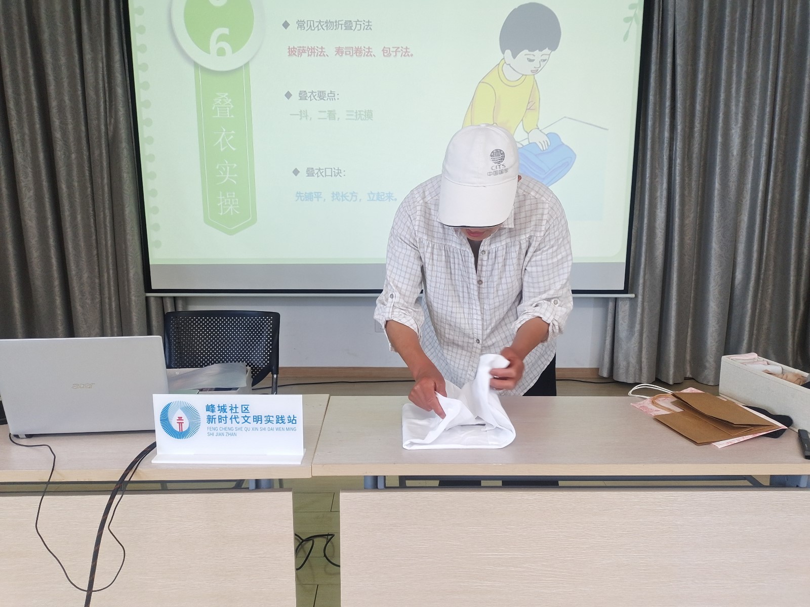 “家是我们生活的空间,也是让灵魂休养的地方。”活动中,朱老师给大家讲解了整理收纳的基本原则、重要性,以及如何进行衣橱整理等知识,同时结合案例分析,解析衣橱结构优化、空间分层利用等核心方法,帮助居民建立系统性整理思维。在专业指导下,居民现场学习“口袋法”“卷折法”等快速折叠技巧,并体验悬挂式收纳、多功能衣架使用等场景化操作‌。通过模拟衣橱整理,学员将杂乱衣物按材质、功能分类存放,直观感受空间利用率提升的成效。