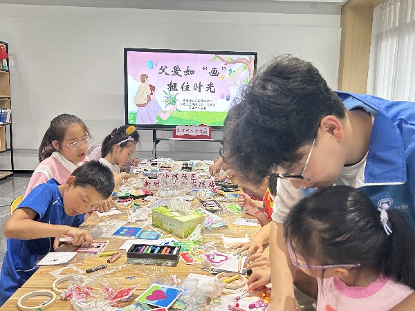 活动现场,宁波职业技术学院的志愿者老师化身 “艺术引路人”,从油画笔触技法到构图逻辑,为孩子们拆解创作密码。孩子们围坐在一起,眼神中满是期待与兴奋。在老师的指导下,他们充分发挥想象力,将对父亲的爱融入到独特的创意中。有的孩子用大胆浓烈的色彩铺满画布,象征父亲炽热的爱;有的通过几何图案的组合,抽象地表达父亲在自己心中的形象。“我爸爸虽然话不多,但总能在我遇到困难时,像超人一样出现”宋雨诺小朋友一边精心调配着颜料,一边说道,“我要用这些色彩,把对爸爸的爱都留在这幅画里。” 随着时间的推进,一幅幅饱含深情的作品逐渐成型。孩子们看着自己的成果,脸上洋溢着自豪的笑容。