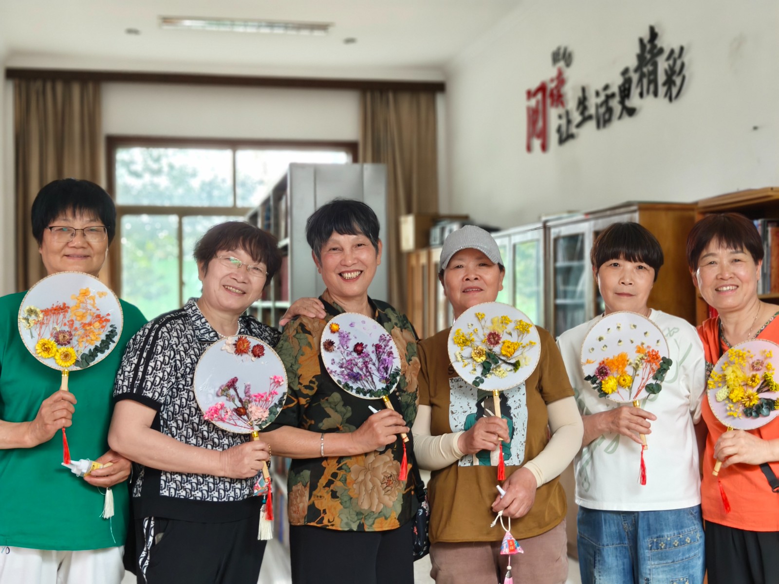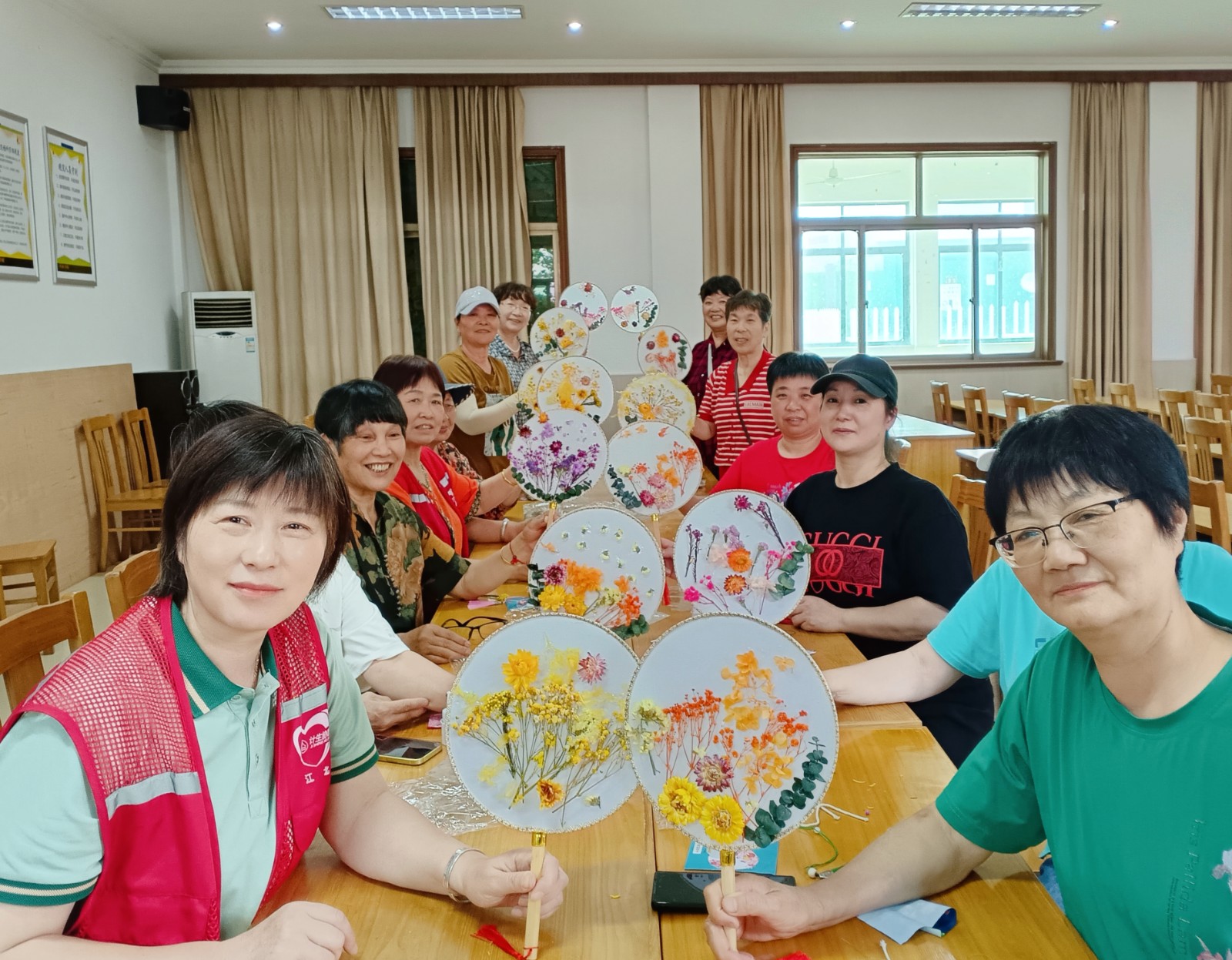 活动当天,志愿者和网格员们提前布置好场地,准备了丰富的活动所需要的手工材料。活动开始,老师耐心地向老人们讲解制作的技巧。老人们兴致勃勃,纷纷动手尝试。大家互相交流、互相帮助,现场充满了欢声笑语。经过大家不懈地努力,老人们都完成了自己的作品。看着手中的手工团扇,大家脸上洋溢着满足的笑容。王阿姨还高兴地说:“平时在家没事做,今天来参加活动,不仅学会了一项新的技能,还收获了一把精美的扇子,感觉特别开心!”一柄素扇 ,肆意点缀。在小小的绢质扇面上构图、粘贴,数朵永生花几经摆弄,一款独一无二的扇子团扇应运而生