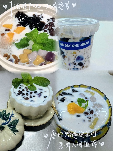 在自由搭配环节,西米的爽滑、烧仙草的清凉与各色配料碰撞出无限可能。有人偏爱传统红豆沙的经典组合,有人尝试加入芒果丁打造热带风情,还有学员现场创新调配 “椰奶 +牛奶” 的独特奶底。1718