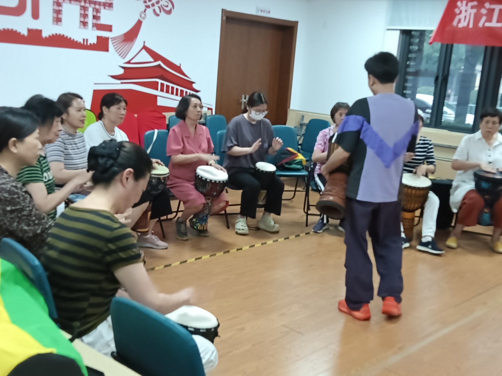 6月10日,天合社区1楼多功能教室热闹非凡,一人一艺“鼓动天合”非洲鼓公益课程正式拉开帷幕,吸引了20名居民热情参与,学员年龄跨度从27至75。该课程共10课时,希望通过这一课程的开展,为喜爱非洲鼓的居民提供交流和学习平台,也为社区增添了一抹别样的活力色彩。