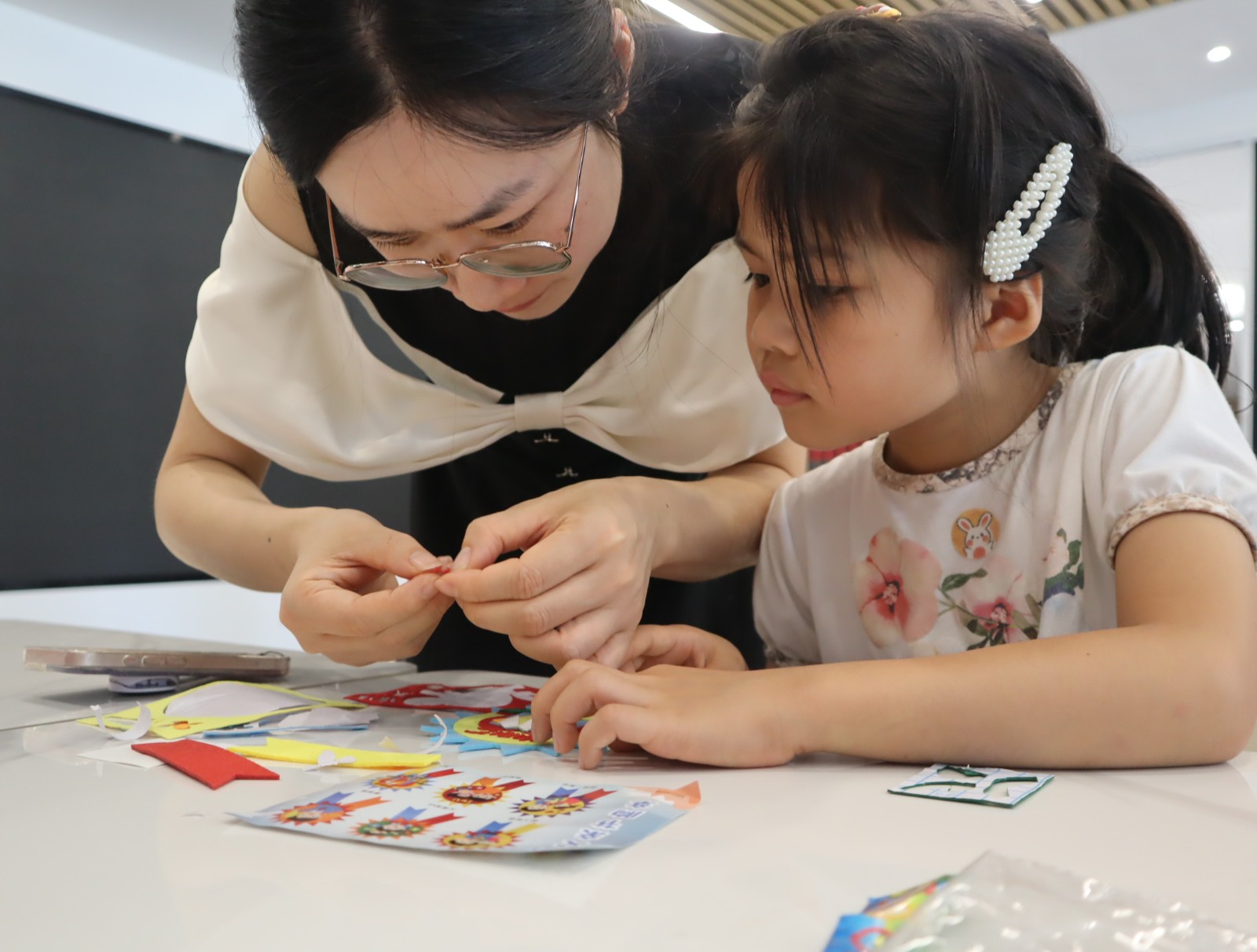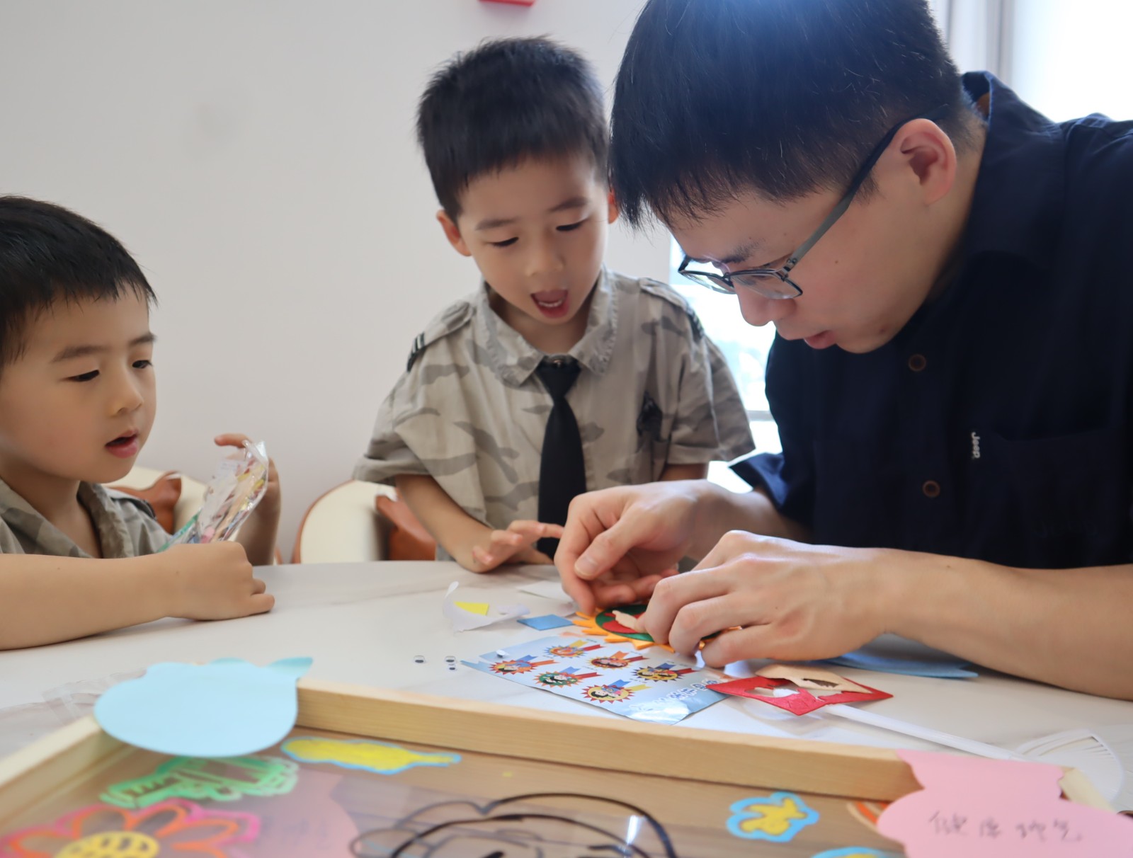 最后,社区网格员通过提问的方式引出了感恩的主题,并向大家介绍了制作画像的基本技巧。随后,孩子们仔细观察着爸爸的容颜,手持画笔,透过透明的画框勾勒着父母的脸庞轮廓,每一个眼神、每一丝微笑,都凝聚着孩子对爸爸深深的爱与观察。孩子们还通过粘土装饰着画像,一幅幅面孔逐渐在相框上浮现出来,他们为爸爸们制作了一副独一无二的画像,将自己的感恩之情化作了一份特别的礼物。活动最后,还通过相机为每个家庭定格下了美好瞬间,并将照片打印下来送给大家作为礼物。