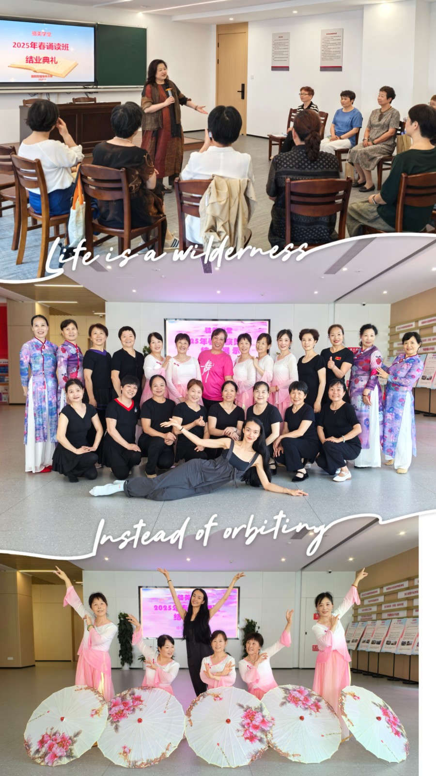 学校两个舞蹈班和模特班把一楼宽敞的大厅当做T台和展示舞台。随着动感的音乐响起,健身操班的学员们活力登场,虽已不再青春年少,但他们身姿矫健,动作整齐划一,脸上洋溢着自信的笑容。形体走秀班的学员们则展现出了另一番魅力,她们步伐轻盈,身姿挺拔,从台步到仪态,从表情到眼神,无不透露着婀娜多姿的韵味,尽显优雅从容的气质,诠释着老年人对美的独特理解与追求。民族舞班舞姿灵动优美,将伞与舞蹈完美融合,时而如行云流水,时而激情奔放,展现出民族舞的风情与魅力。诵读班的朗诵展示中,学员们声情并茂,或慷慨激昂,或深情款款。他们用富有感染力的声音,诠释着经典诗词与文章的内涵。照片视频班举行的结业典礼更是将骆美学堂学期最后一课推向高潮,班级通过作品展示、优秀学员表彰及班级学员个人才艺展示,让大家看到了中老年人紧跟时代步伐,热爱生活勇于尝试新事物的精神风貌。