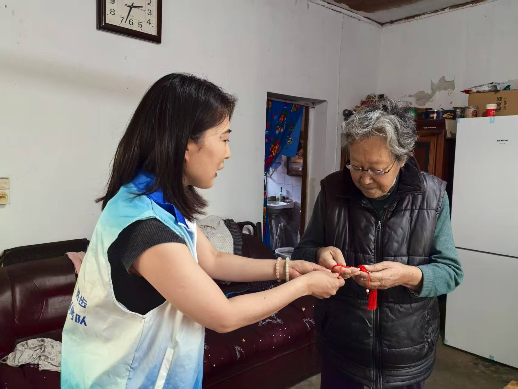 志愿者们不仅送上了香囊,更送上了贴心的陪伴。他们坐在老人身边,与老人拉家常,询问老人的身体状况和生活需求。有的老人腿脚不便,志愿者们就主动帮忙打扫房间、整理衣物;有的老人喜欢听故事,志愿者们就耐心地陪老人聊天,听老人讲述过去的故事。