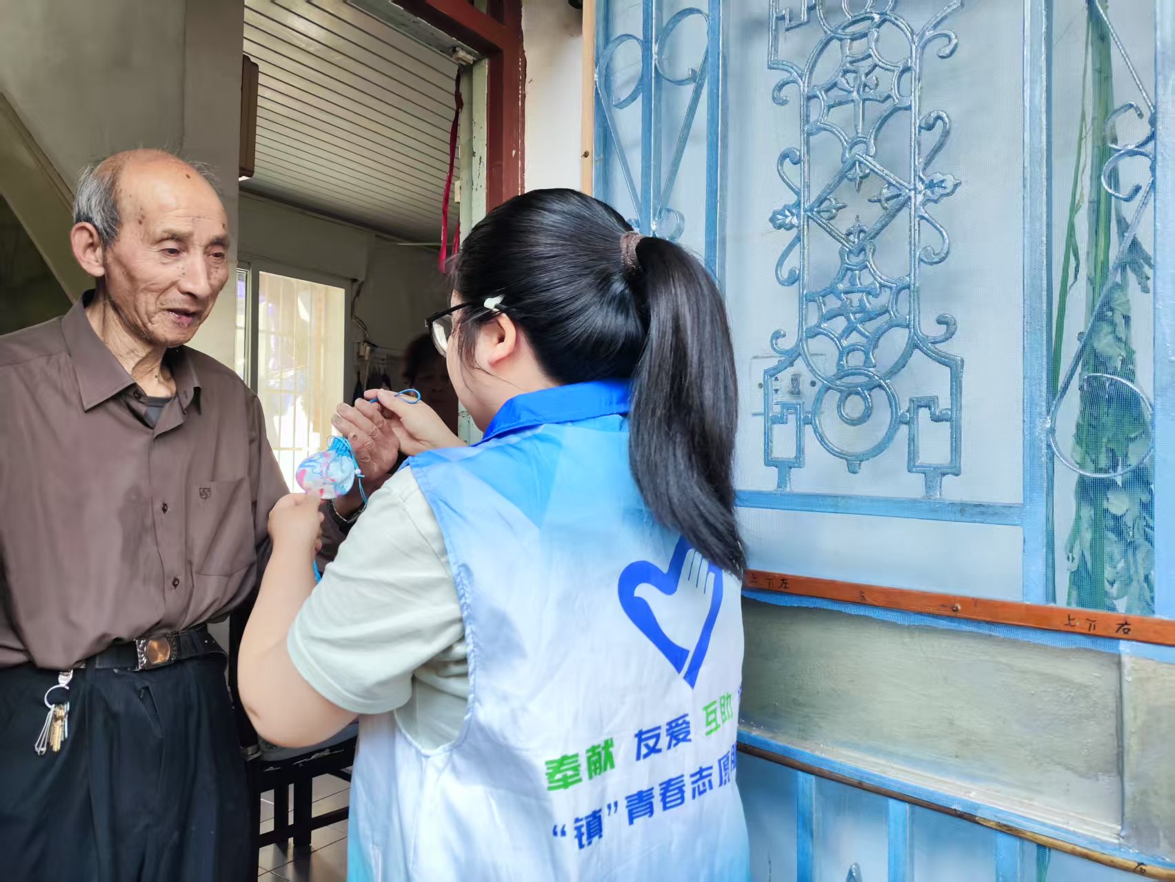 “大爷,这香囊里装的是艾草,有驱蚊的效果,晚上睡觉放在床头,能让您睡得更安稳。”“镇”青春志愿者小张微笑着对85岁的张大爷说道。张大爷接过香囊,放在鼻尖轻轻嗅了嗅,脸上露出了欣慰的笑容:“谢谢你们啊,这么热的天还想着我们,这香囊闻着真舒服。”