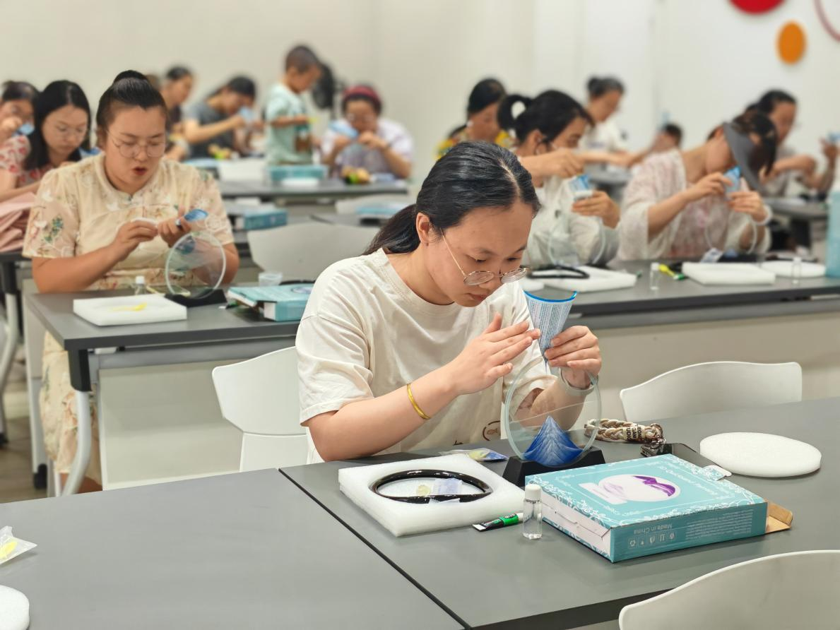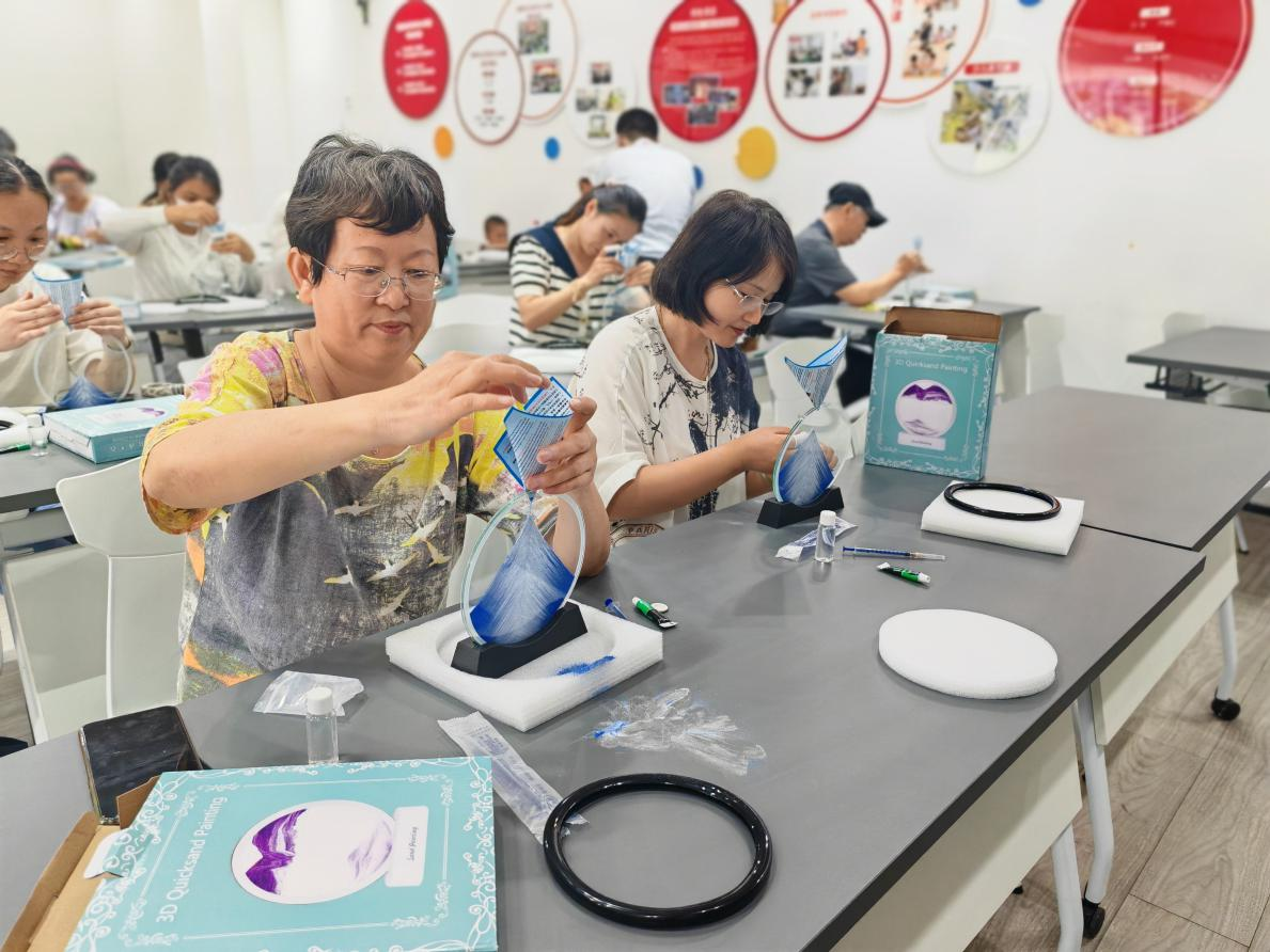 在制作过程中,大家相互交流、相互帮助,分享着自己的创意和心得。原本陌生的邻居们因为这次活动变得熟悉起来,欢声笑语回荡在整个活动现场。一位社区居民感慨地说:“平时大家都忙,很少有机会像这样聚在一起聊天、做手工。这次活动不仅让我们体验到了创作的乐趣,还增进了邻里之间的感情,感觉特别温暖。”一个小时的时间转瞬即逝,一幅幅精美的蓝白流沙画在大家的巧手下诞生,每一幅都凝聚着参与者的心血和创意。活动最后,大家纷纷拿着自己的作品拍照留念,记录下这美好的瞬间。