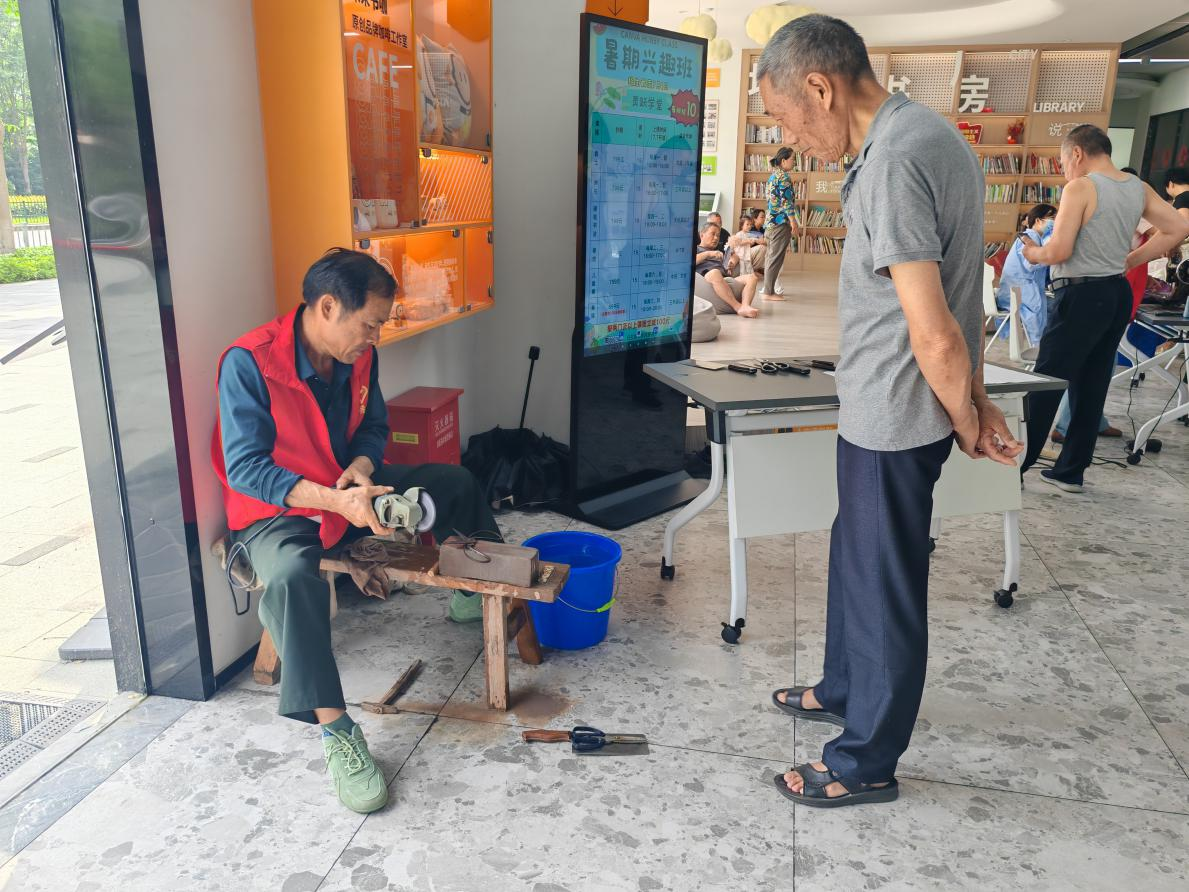 社会组织的党员志愿者团队带来的磨刀、修伞、缝纫服务成了当天的“明星项目”。磨刀师傅一大早就到了现场,他熟练地支起磨刀石,接过居民递来的菜刀,先仔细查看刀刃的情况,然后开始有节奏地打磨。随着“嚓嚓”的声响,刀刃逐渐变得锃亮。“师傅,您这手艺真绝了,我这刀都钝好久了,您这一磨,跟新的一样!”一位居民接过磨好的刀,忍不住竖起了大拇指。修伞摊位上,师傅正专注地修理着一把破损的雨伞。她仔细检查着伞骨和伞面,找出问题所在后,熟练地拿出工具进行修补。不一会儿,原本“千疮百孔”的雨伞就又能正常使用啦。一旁的缝纫摊位也不闲着,阿姨手法娴熟,根据居民的需求,或修改裤脚长短,或缝补破洞衣物。