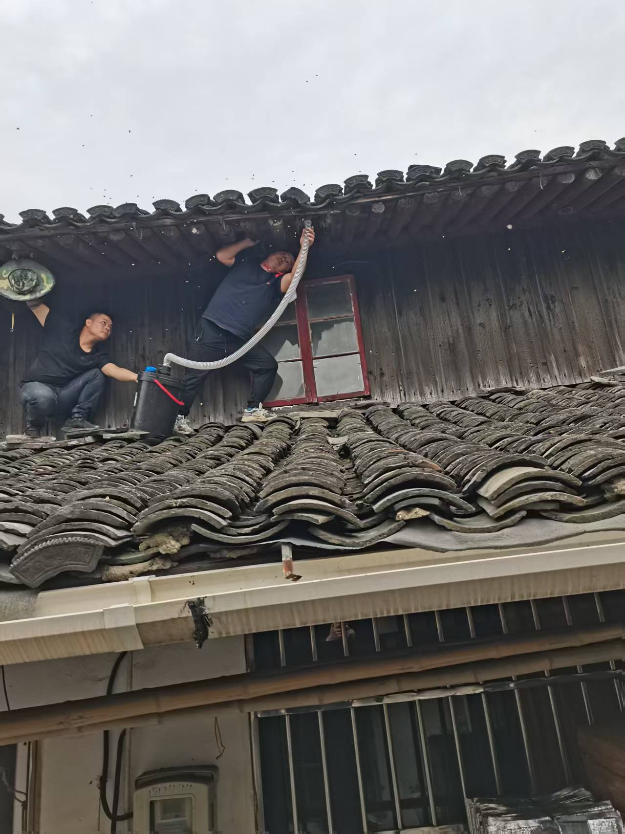 次日清晨,消防车闪着警示灯抵达现场。小俞早已在此等候,她协助消防部门工作人员用醒目的黄色警戒带圈出安全区,并引导居民们退至安全范围之内。消防部门工作人员们手里拿着专业工具,登上云梯,小心翼翼地接近蜂窝,喷药、铲除、吸附、装袋、……每一步操作都精确而慎重,一会儿工夫,网纱袋里就装上了密密麻麻的黄蜂。在众人专注的目光下,那悬垂的灰褐色蜂巢终于被彻底清除干净,屋檐下只剩一道微痕,像是隐患被细心拭去后留下的淡淡印迹。