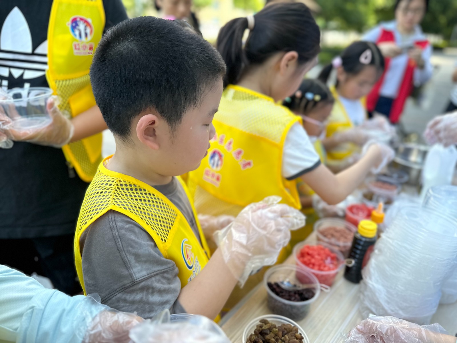 活动伊始,“红小萌”小小志愿者们在工作人员的指导下,迅速投入到清凉饮品的制作中。洗水果、调配、装杯,每个步骤孩子们都做得认真又专注。尽管现场忙碌,但秩序井然,孩子们相互协作,不时交流着制作心得,欢声笑语回荡在整个活动场地 。不一会儿,一杯杯色彩诱人、果香四溢的解暑饮品便摆满了桌面。随后,志愿者们将饮品仔细分装,并贴上他们自己精心设计的暖心小标签,上面写着“您辛苦了”“注意防暑”等温馨话语。