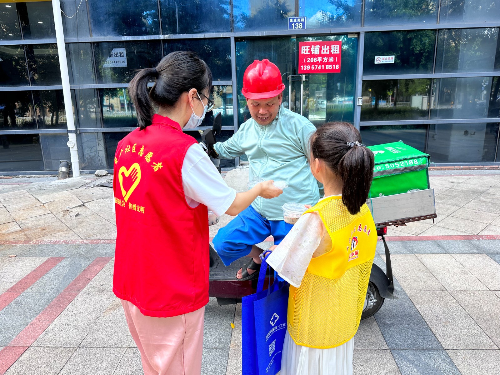 完成饮品制作后,“红小萌”们兵分多路,在党员志愿者的带领下寻找那些在烈日下坚守岗位的户外工作者。当遇到环卫工人、外卖快递小哥、保安时,孩子们立刻迎上前去,双手递上清凉饮品,并送上真挚问候。在天合网格中有一家顺丰驿站,该点位的顺丰小哥们收到这份意外惊喜,脸上绽放出灿烂笑容,连连对小志愿者们表达感谢。