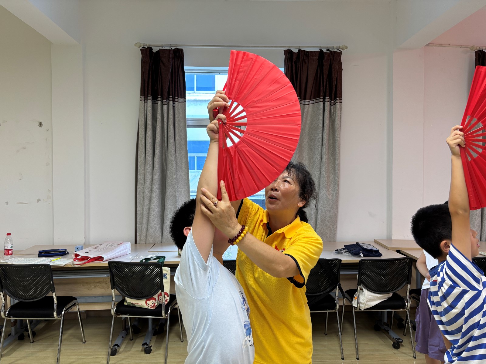 贺老师拥有多年功夫扇教学经验,课堂上,贺老师讲解了功夫扇的起源、发展以及蕴含的文化内涵,激发了孩子们的学习兴趣。贺老师从最基本的握扇姿势、步伐移动开始,耐心细致地示范每一个动作要领。大家认真听讲,一招一式间尽显少年风采。