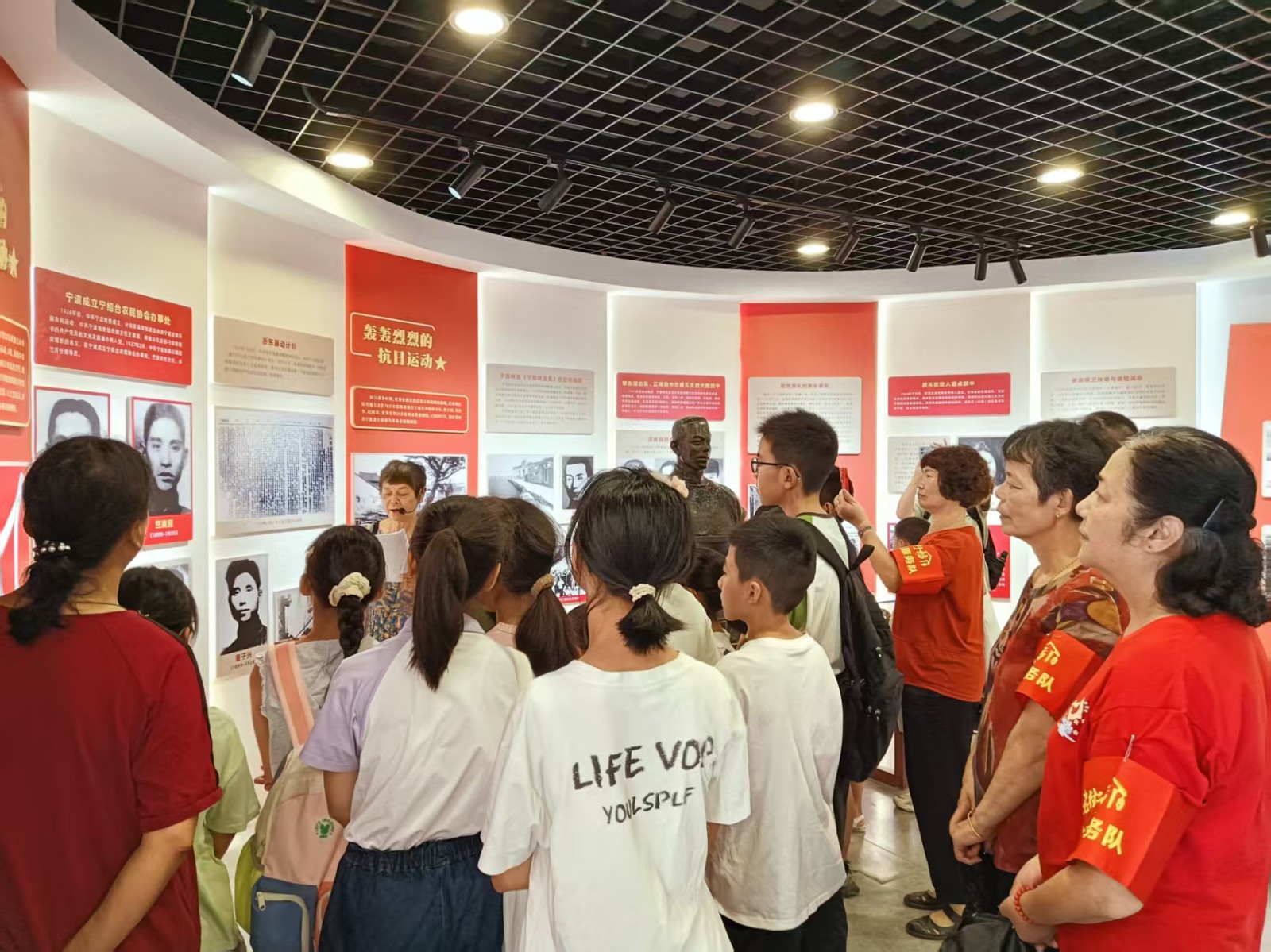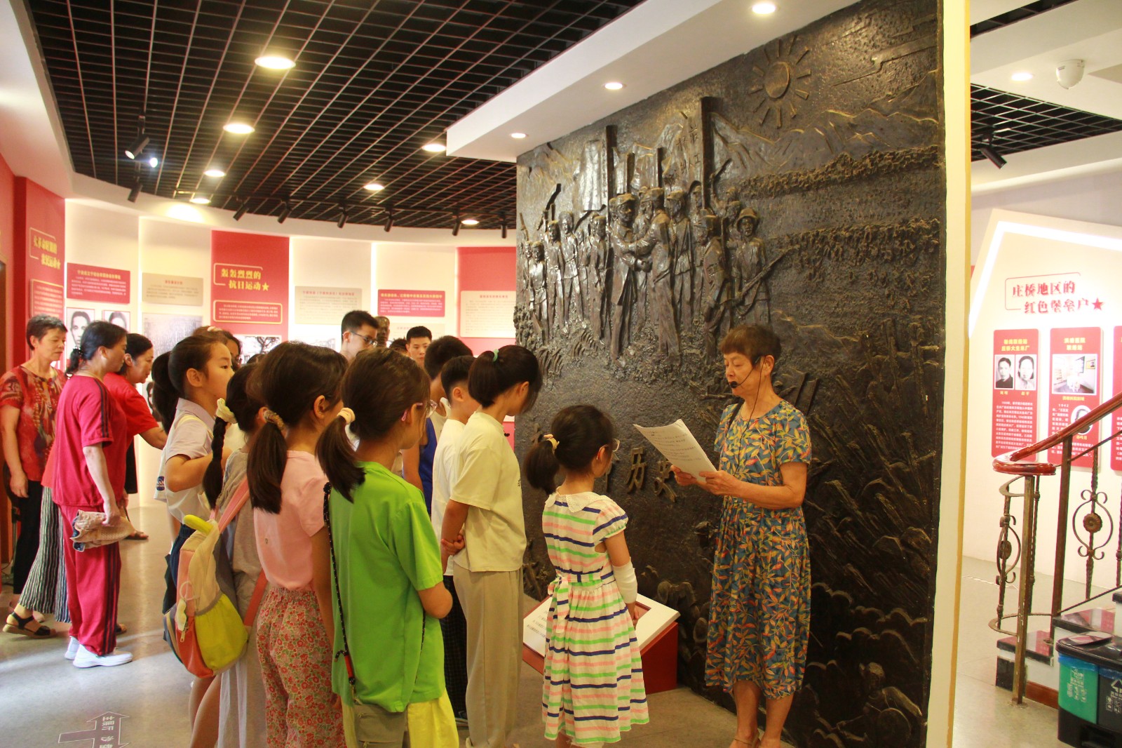 由于报名参与的小朋友过多,社区的老街坊志愿者们早早的来到了现场,全程护航此次活动,以赤诚之心为年轻一代铺就了一条感悟历史、汲取力量的红色教育之路。步入庄严肃穆的纪念馆,时光仿佛回溯至烽火连天的岁月。在讲解员汤老师声情并茂的讲解中,一幅幅定格苦难与抗争的黑白照片、一件件锈迹斑斑的杀敌武器、一位位泛黄的英雄形象不再是冰冷的展品。孩子们屏息凝神,指尖轻触玻璃展柜下遗留的弹痕,仿佛回到了当时庄桥的几位先烈奋斗的战场。