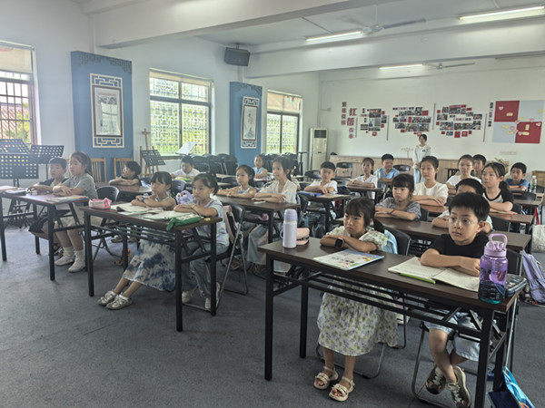 “同学们,很高兴我们又见面了!今年,我们又将一起在假日学校度过丰富多彩的一个夏天。”在陈华浦文化礼堂内,社区教育志愿者戴源鑫正激情满满地向小朋友致以问候,表达对他们的祝愿与期望,台下小朋友们笔直地坐在课桌前,专心致志地听讲着。